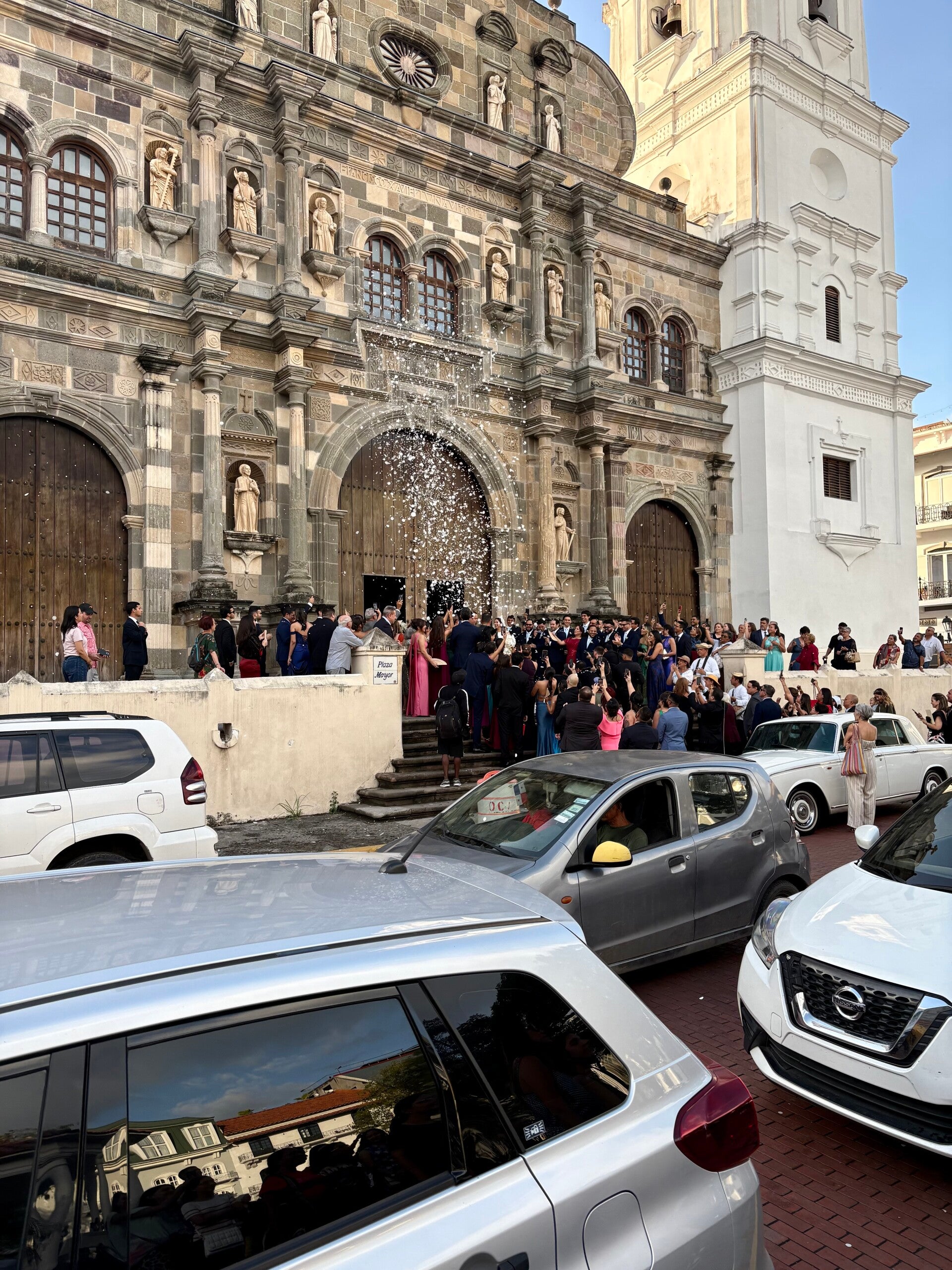 Ons nieuwe hostel heeft met een plekje aan de rand van Casco Viejo bij Plaza Santa Ana (dat pleintje waar Geertje probeerde om met haar vader bellen in zo’n telefooncel) een gunstigere locatie dan dat we gewend zijn van de Panamese hoofdstad en na ons opgefrist te hebben staan we met een pas of veertig á vijftig alweer tegen de eeuwenoude Spaanse koloniale architectuur te kijken. Als we weer bij het vertrouwde Plaza de la Independencia zijn, worden we verrast: er is een bruiloft gaande bij de kerk waar we tweeënhalve week eerder nog naar binnen liepen! Feest, goed geklede Panamezen, muziek, zang, dans, confetti: de bingokaart is weer vol!