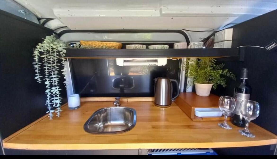 Nu Binky eindelijk een campervan is, heeft hij een hybride bank-bedcombinatie laten installeren, een opbergkastje, een klein keukenblok met een gootsteen en zelfs aan een laminaatvloertje heeft Binky gedacht. Binky is met zijn drieëntwintig jaar niet de jongste meer. “Je bent nooit te oud om te reizen!” bromt Binky vrolijk als we het over zijn leeftijd hebben. En hij heeft gelijk: met 180.000 kilometers op de teller is Binky nog zo fit als de jeugdige generatie. Wel een klein puntje van aandacht: hij is allergisch voor benzine, maar diesel is z’n favoriete drankje. Staat genoteerd en ook dat hij echt een zonaanbidder is. Binky heeft namelijk ook wat zonnepanelen aan laten meten als secundaire batterij. Binky, op naar veel avonturen!