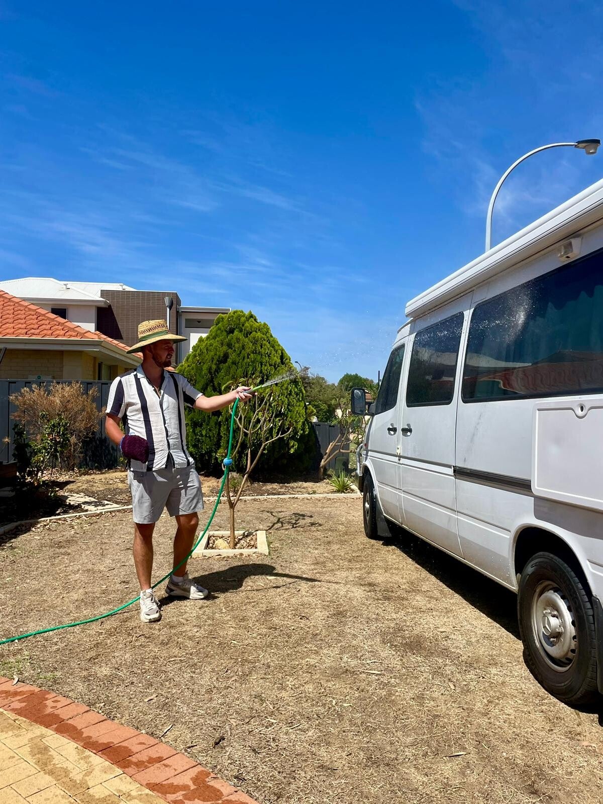Eenmaal terug moeten we nog één uur wacht tot mijn limiet verhoogd wordt. We doen nog maar een bakje koffie, Jillian legt nog één keer alle functies van de campervan uit en we wassen ‘m zelfs van de buitenkant, terwijl Jill zich naar buiten haast met een hoed en een pet uit angst dat we ons verbranden (wat een gruwelijk lieve vrouw is ze). Steeds vaker spookt het idee door ons hoofd dat we de campervan voor een ander aan het wassen zijn, want er is nog niet echt iets dat mee heeft gezeten. We lachen er maar mee, maar verdomd, dat zou wel heel vervelend zijn.