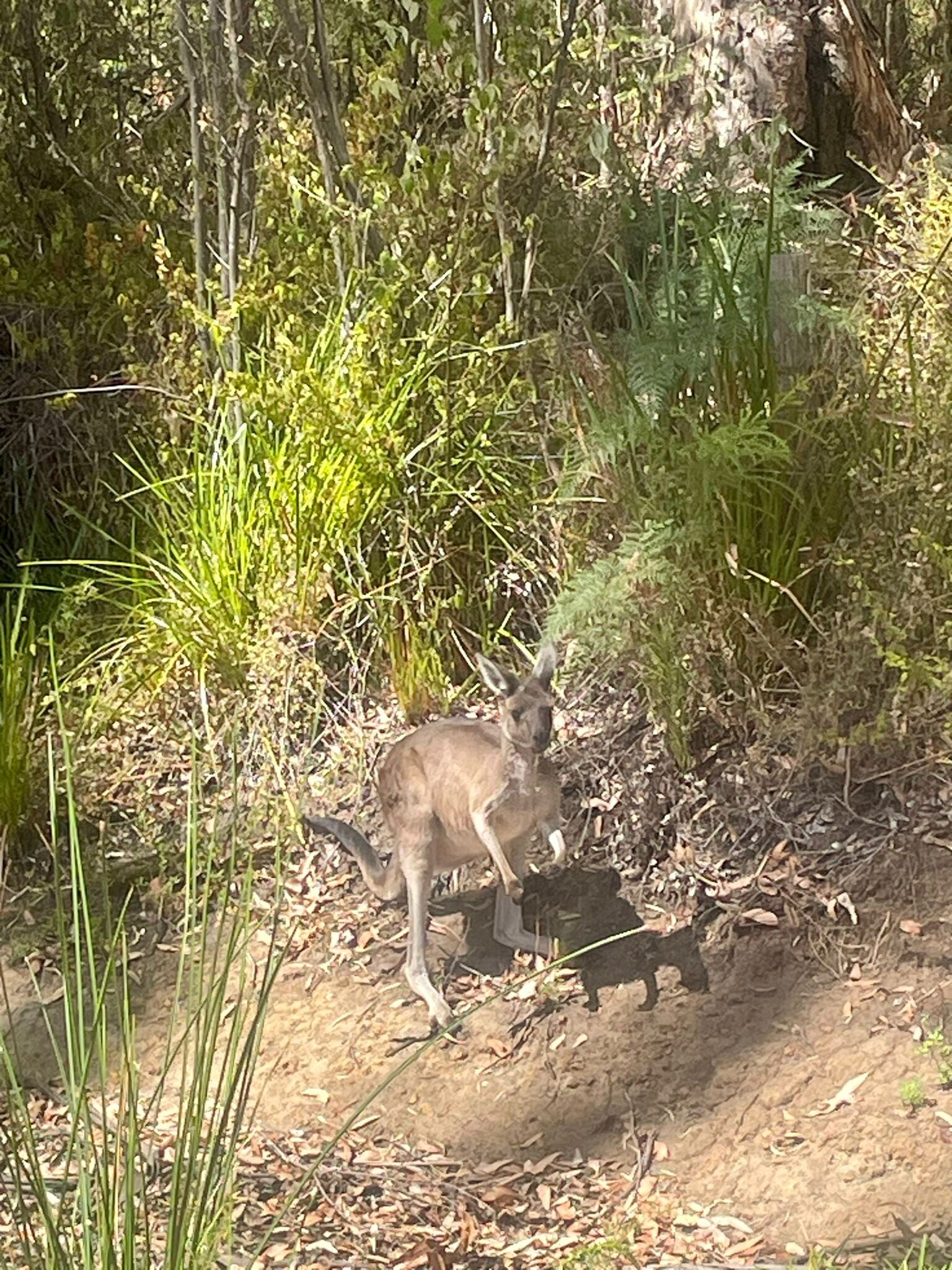 Als we aan de wandeling beginnen zijn we niet met onze omgeving bezig. We prakkeseren, piekeren, wikken en wegen over onze voortzetting. Wat gaan we doen? Hoe pakken we de komende dagen aan? Focussen we ons op de na-Sjoerdse periode? We lopen rond een meer en opeens schrikken we ons tien sombrero’s bij elkaar. Verzonken in gedachten springen er een paar meter naast ons twee kangoeroes op, die daar gewoon de hele tijd zaten, maar omdat we zó erg met alle mogelijke scenario’s in onze hoofden zaten, hebben we die beesten niet eens gezien! Wijselijk respecteren we de personal space van de twee prachtbeesten en maken we rechtsomkeert.