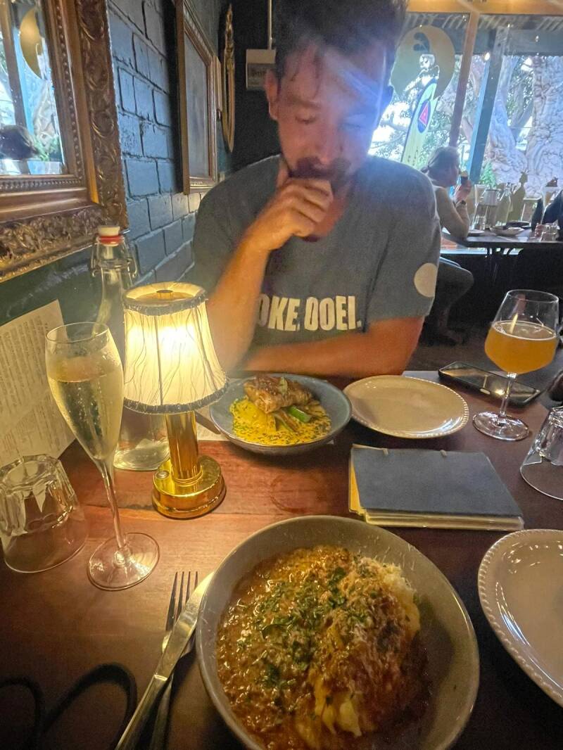 We zijn in Australië nog maar twee keer buiten de deur wezen eten. Eén keer in Perth bij de Mac, één keer in Mount Barker bij dat bruine cafeetje. Hoog tijd om dat nog een keer te doen. We duiken Denmark in en Denmark is leuk. Kneuterig, kleinschalig en eigenlijk is er niet zo veel te beleven, maar toch is het gewoon zo’n typisch Australisch dorpje dat iets groter is dan het gemiddelde Zuidwest-Australische gehucht. Met een paar schattige winkeltjes en een handjevol leuke restaurantjes is het hier prima te vertoeven en dat heeft iets knus, iets kneuterigs en iets veiligs. We eten bij Flame Trees. We zijn tenslotte in Australië en we kunnen natuurlijk niet zeggen dat we in Australië zijn geweest zonder een keer kangoeroe gegeten te hebben. Ik ben niet zo’n biefstukliefhebber, maar Geertje wel en omdat kangoeroes toch onder de categorie runderen vallen, besluit ik gewoon kip te nemen en een paar hapjes van Geertje te nemen en hoewel de kip heerlijk is (de kwaliteit van Flame Trees is even een trede hoger dan de toeristische fish-and-chipsfabrieken in Zuidoost-Azië), smelt de kangoeroe zowat op je tong. Aanrader? Zeker. Eet kangoeroe! (Die hebben ze hier meer dan mensen, dus die kunnen ze wel een paar missen.)