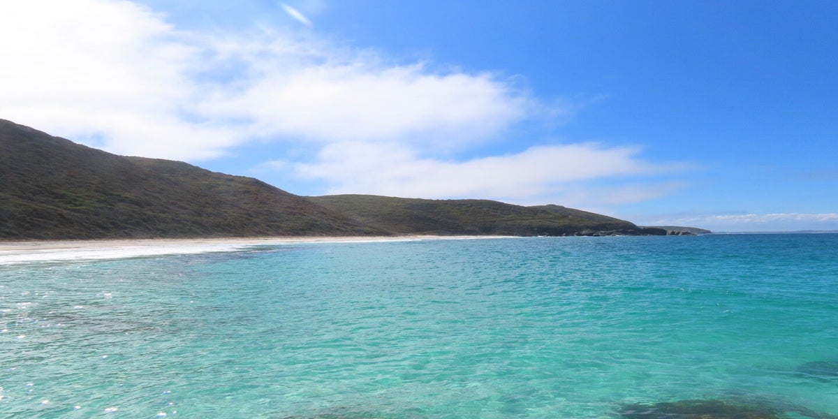 Dat ontdekken we niet meteen. Er is blijkbaar ook nog een zogeheten Greens Pool en daar gaan we eerst maar eens heen alvorens we ons trakteren op de hoofdattractie. De Greens Pool blijkt gewoon de kust van de Grote Australische Bocht (zo heet de zee waarop we uitkijken) te zijn. Waarom dat water hier de Greens Pool heet? Ik denk dat je dat zelf behoorlijk accuraat kunt inschatten, want de zee heeft hier een magnifieke groene gloed. Een prachtig plaatje en adembenemend mooi stuk natuur. Hier en daar zwemmen wat mensen, maar wij niet, want we hebben onze zwemkleding bij Binky achtergelaten en zo’n heel grote ramp vinden we dat niet. Het is behoorlijk frisjes (shirt en korte broek kunnen nog nét onze goedkeuring genieten) en het zeewater is koud.