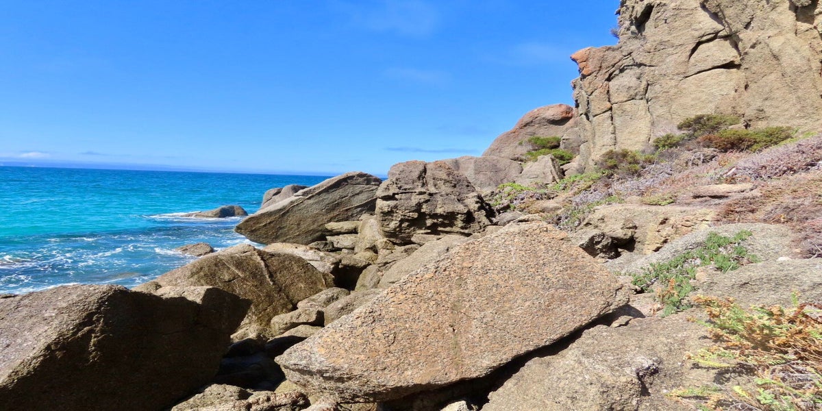 Shelly Beach delen we met vier andere auto’s. De eigenaars? Een soloreiziger, een oudere man, een jong koppel net als wij en een flierefluiter die z’n gezicht geen seconde heeft laten zien. Alleen dat al maakt dit afgezonderde stukje machtige natuur het bezoeken waard: je hebt de hele bedoening bijna voor jezelf! Een parelwit strand, stevige grote golven van soms wel twee meter hoog, hoge groene heuvels die de zee flankeren en een paar prachtige, als door mensenhanden gehouwen rotspartijen waar ik het na een strandwandeling niet kan laten om er even op te klimmen. Het is ook eindelijk weer eens goed weer vandaag: de lucht is helderblauw, de zonnestralen schijnen warm en niet te heet en het zeebriesje verkoelt perfect.