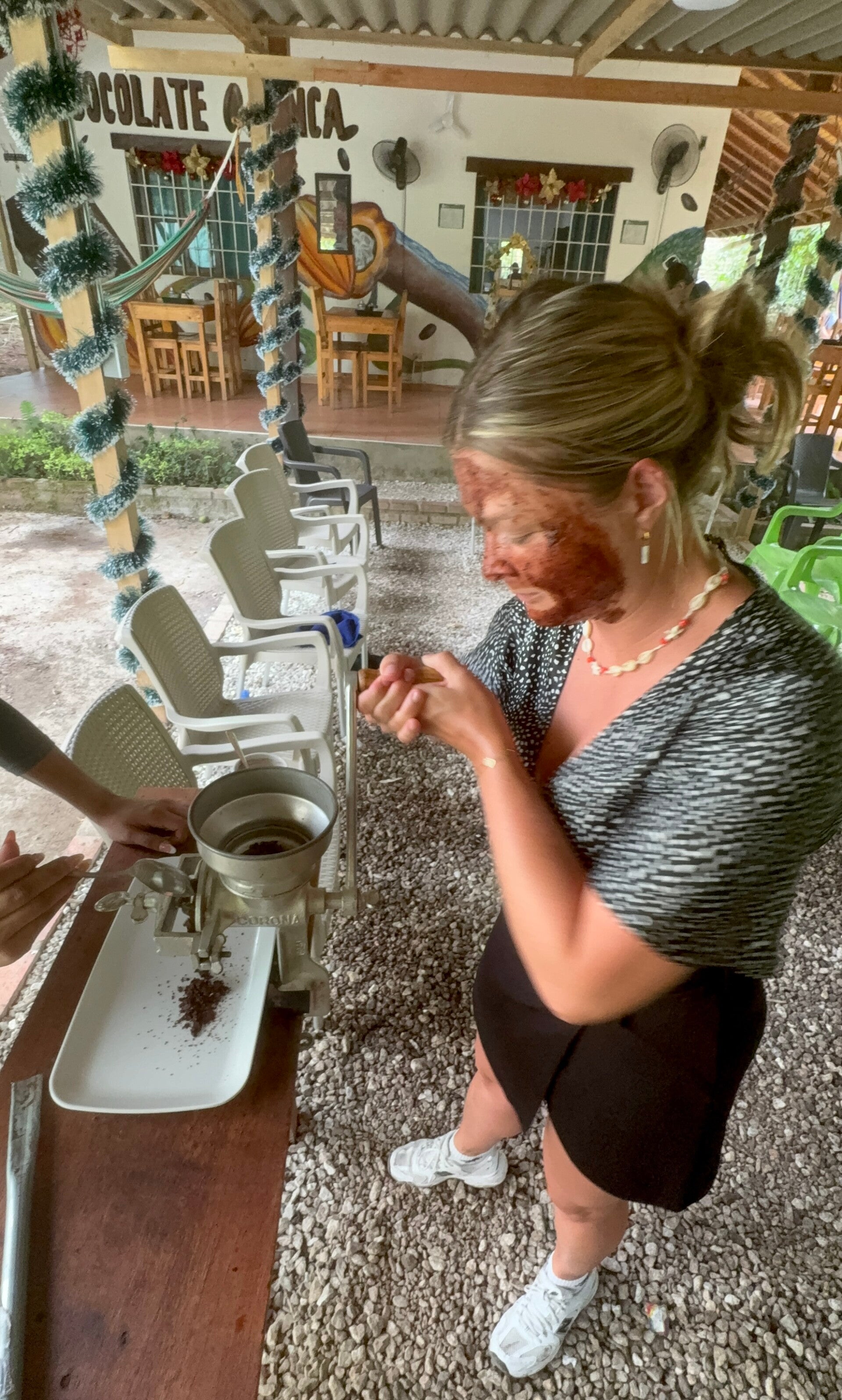 Cacao blijkt ook nog ons goed te zijn voor je huid! Ja, echt, wat ons betreft wordt cacao voor de twenties wat quinoa en avocado voor de healthy lifestyle influencers in de moderne tens waren. We krijgen een handcrème van cacao en een cacaogezichtsmasker en hoewel het lijkt alsof we in een intens poepgevecht verwikkeld waren (je zag het al op die foto hierboven), is onze huid zo zacht als die van een baby zodra we het eraf gewassen hebben. We weten dat melkchocolade ongezond is en dat er dus vaak helemaal geen cacao in zit, maar als we terugkomen in Nederland gaat dit tourtje nog heel vaak gebruikt worden als excuus om een jaarvoorraad aan chocoladerepen in een avond buit te maken!