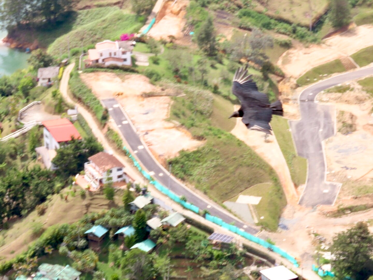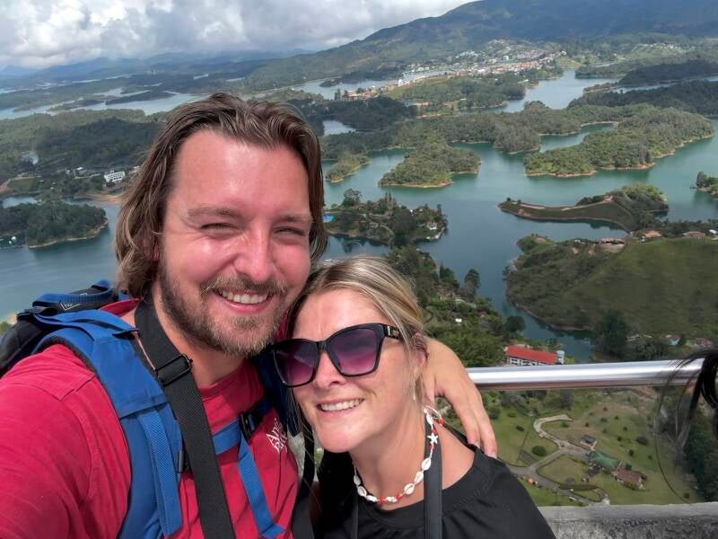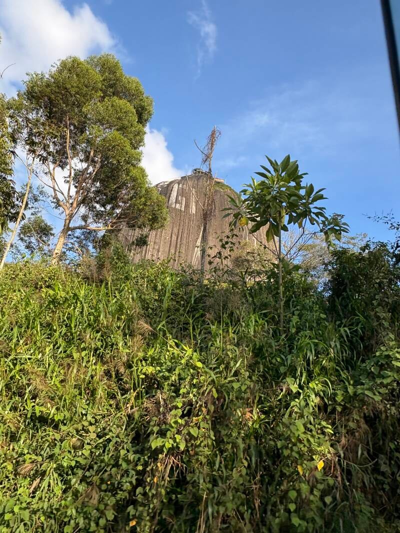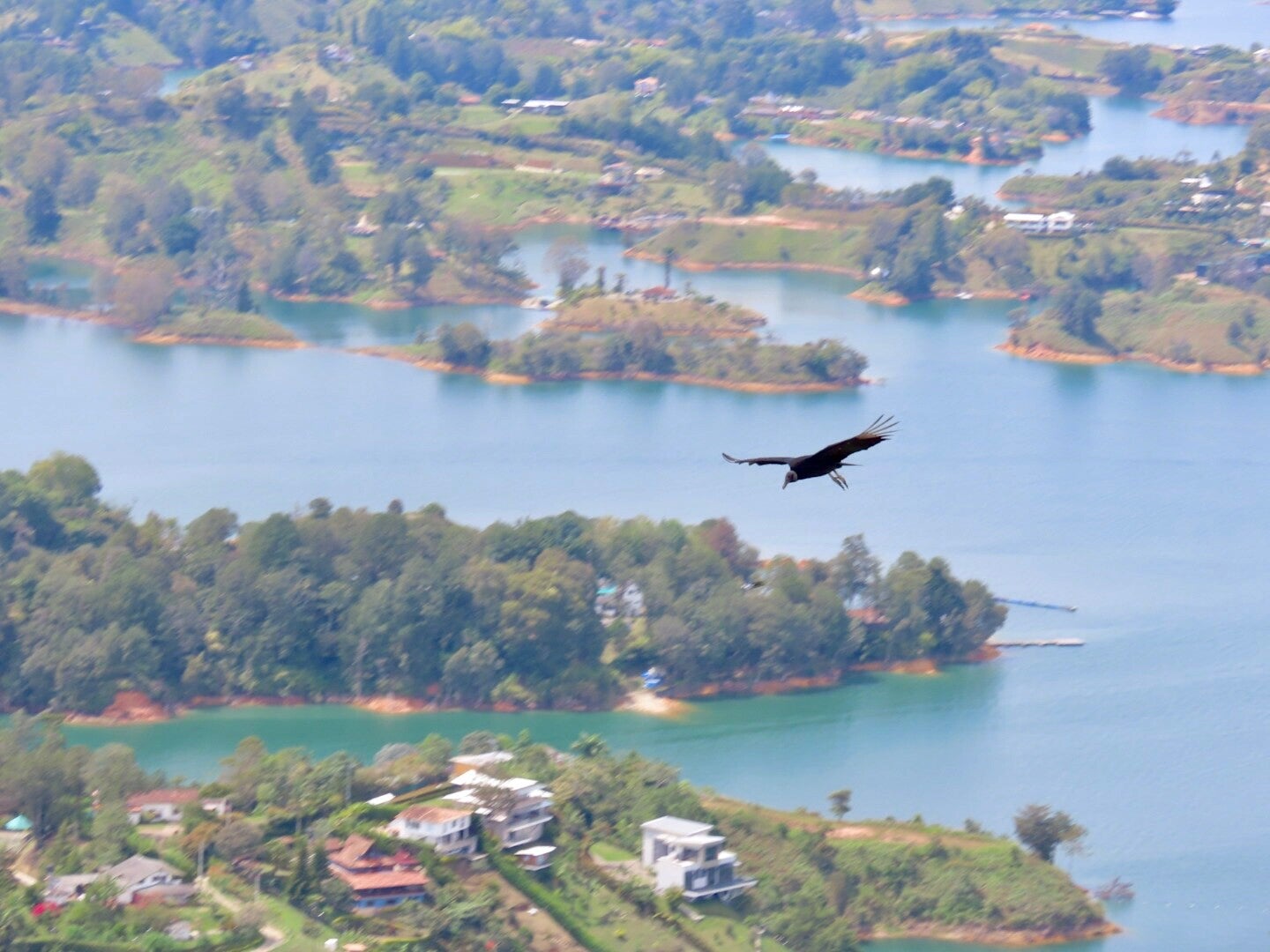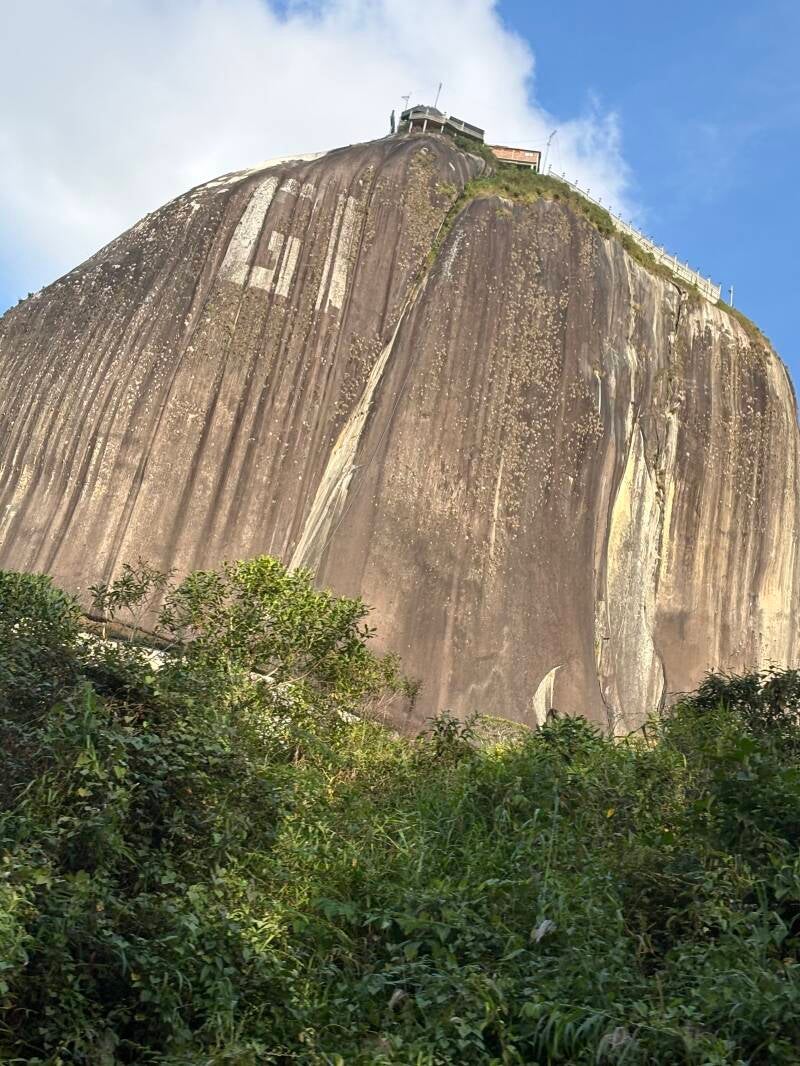Hoewel we bekaf zijn, is de omgeving een van de mooiste die we tot nu toe gezien hebben. Die Piedra del Peñol: het is alsof Moeder Aarde een enorme steenpuist heeft die ze een keer moet uitknijpen. Ik weet dat dat niet zo aantrekkelijk klinkt maar stel je maar eens voor dat die steenpuist echt super mooi is. 220 meter hoog, in een gebied van een kronkelend stuwmeer, groene heuvels en een heleboel vogels die om de steenpuist heen cirkelen. Nou maar hopen dat Moeder niet vandaag besluit om die puist uit te knijpen. Maar ja, ’t is ook geen vulkaan of zo, dus dat kan eigenlijk ook helemaal niet.