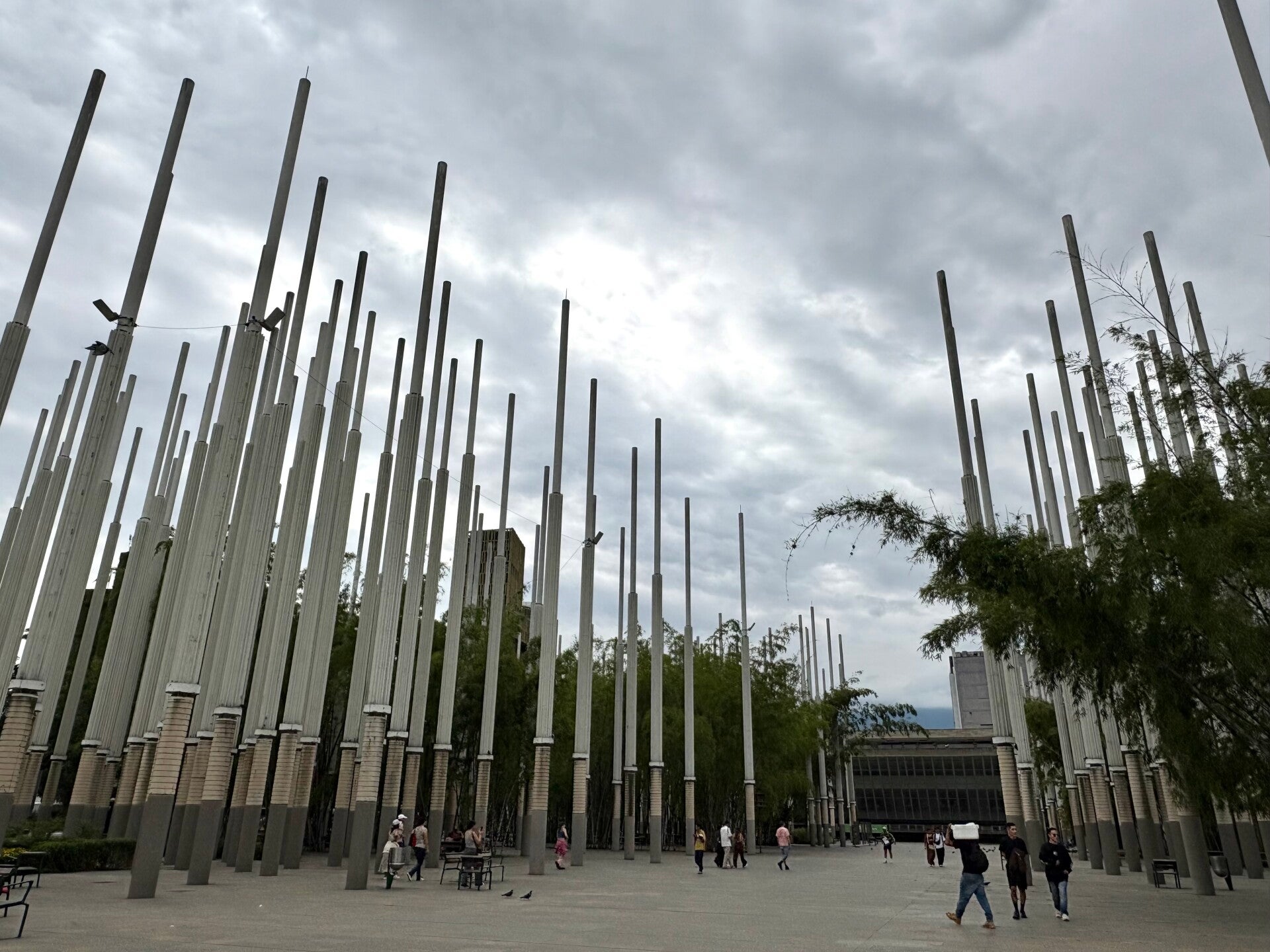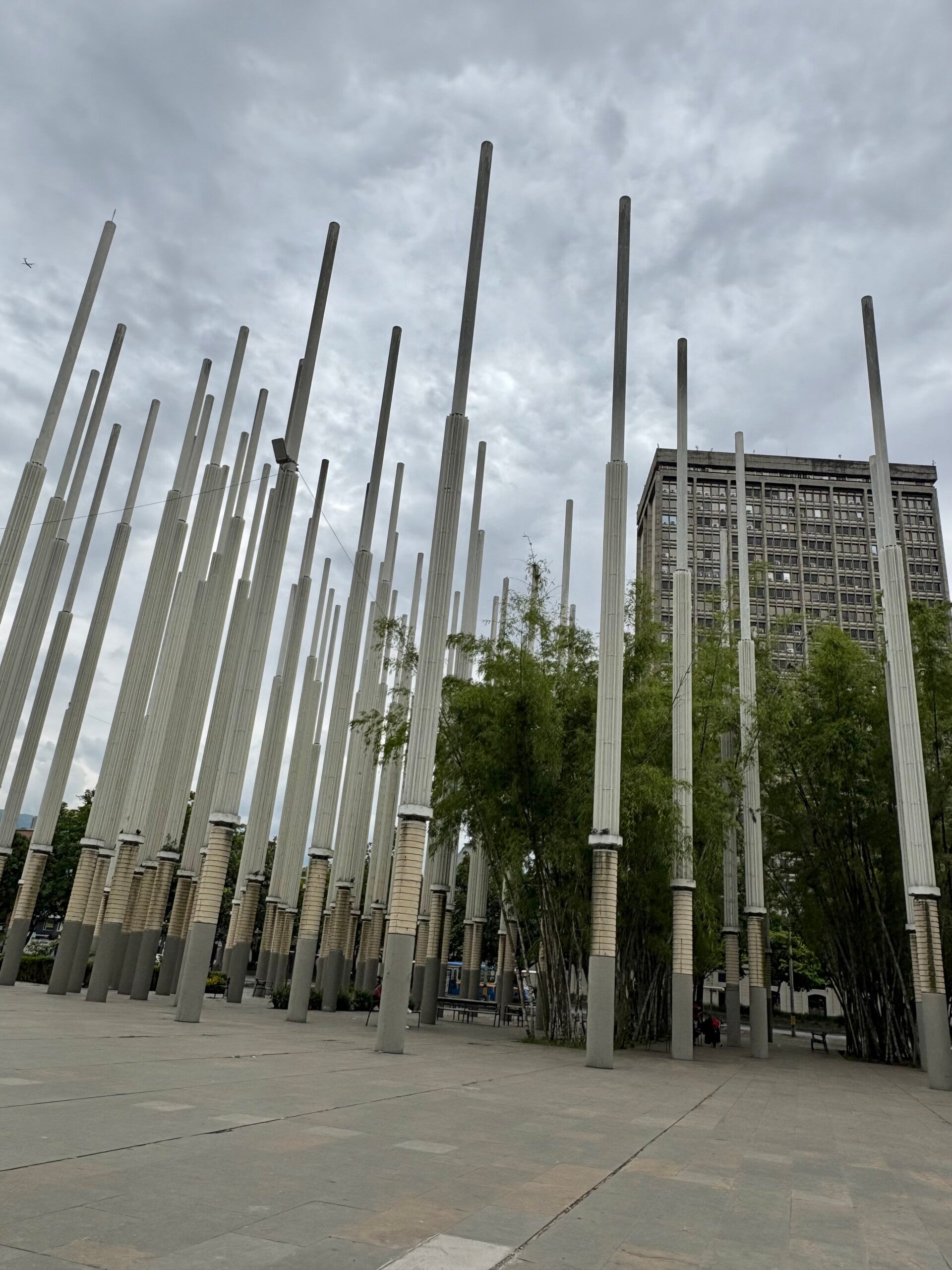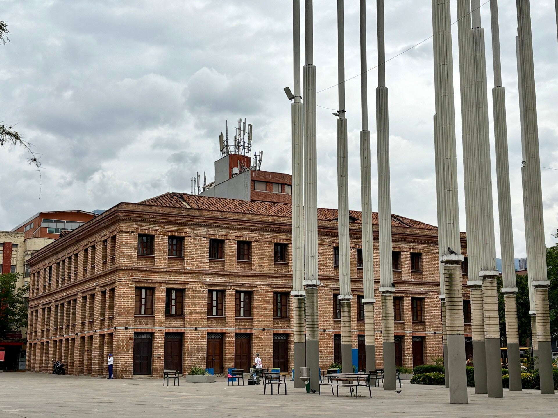 We beginnen bij het Plaza de las Luces, een plein met een stuk of 300 grote pillaren van 24 meter hoogte die samen een soort bos vormen en ’s avonds licht geven, geflankeerd door twee prachtige bakstenen gebouwen, Vazquez en Carré. Weer zo’n park dat gebouwd is om de wederopstanding van Medellín te vieren. Ten tijde van de drugsoorlog was dit een van Medellíns gevaarlijkste pleinen, maar nu dus niet meer. Indrukwekkend, maar volgens Gemini (de plaatsvervangende gids van vandaag) zou het hier normaliter stikken van het kantoorpersoneel en de straatverkopers. Nou, kijk op de foto’s. Geen kip te bekennen. Slechte gids, Gemini, slechte gids.