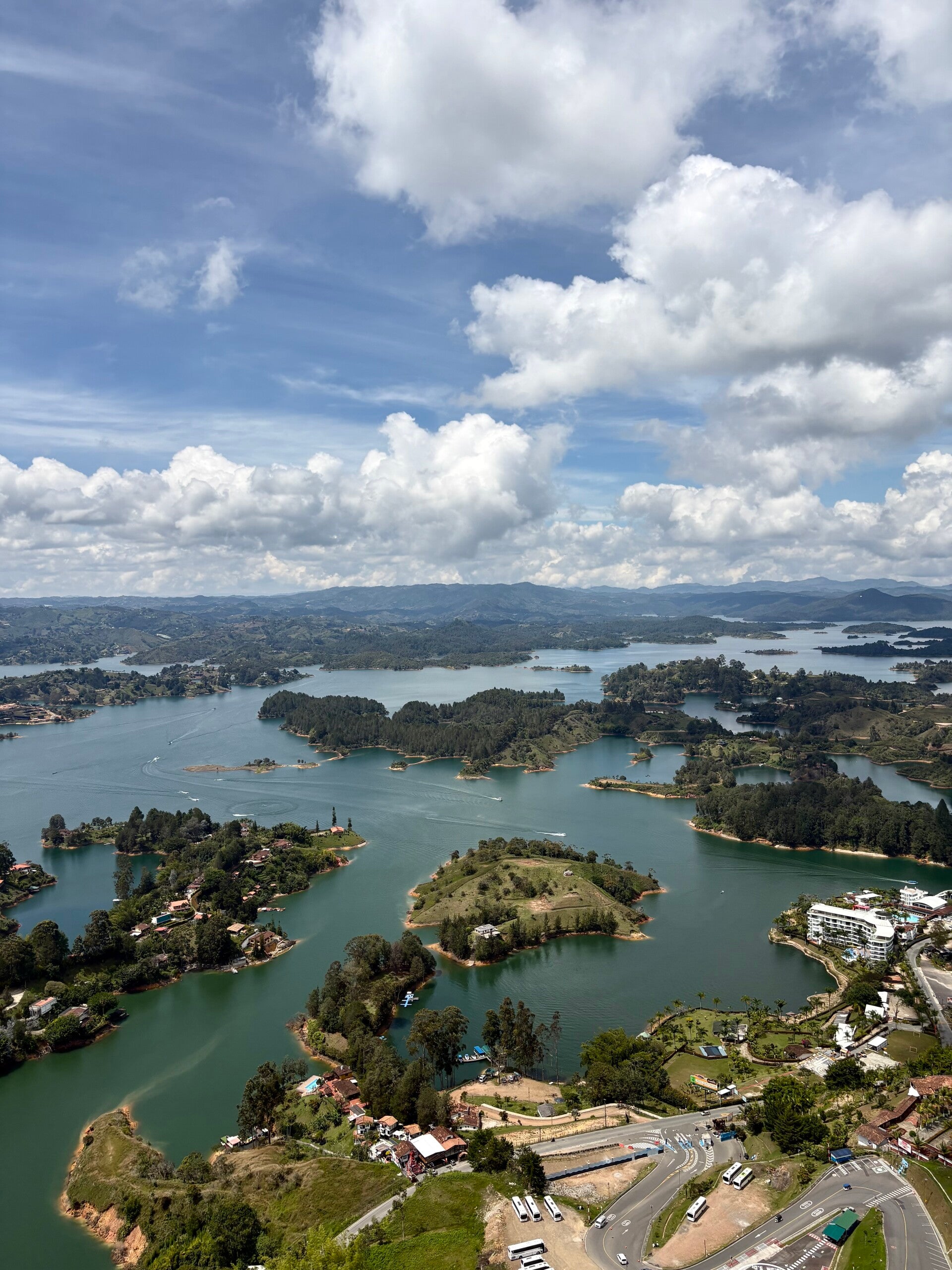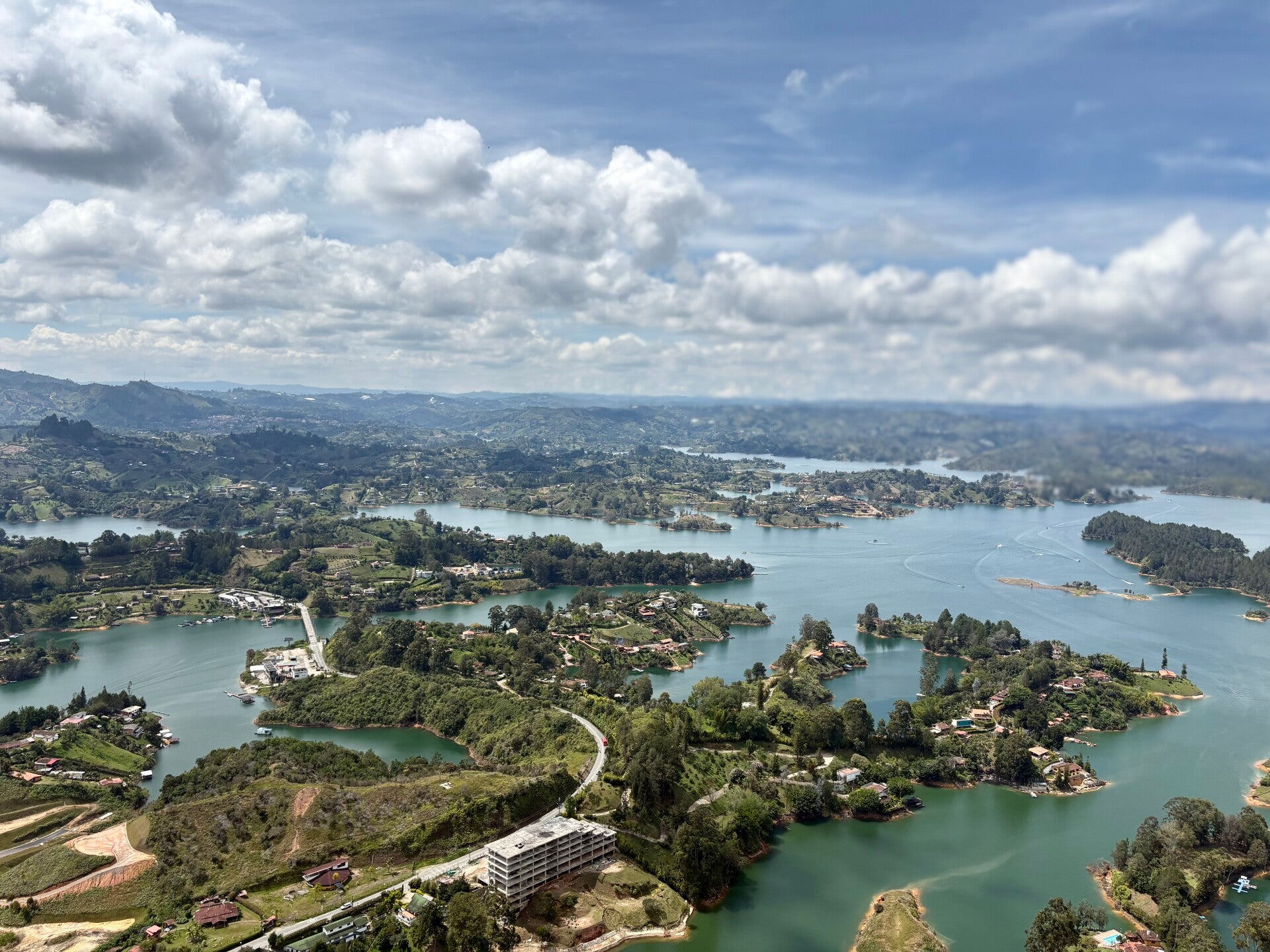 Op dik twee uur rijden van de stad ligt Guatapé, een dorp dat voor veel Colombianen een dagtrip is. Een dagtrip, twee uur rijden. Laat het even inzinken, hé? Wij Nederlanders zijn echt het meest verwende volk ter wereld als het om afstanden gaat, want als wij twee uur rijden in Nederland dan moeten we minimaal een weekendje weg zijn. Maar goed, Guatapé, dagtrip voor Colombianen. Waarom? Eén antwoord: de mysterieuze granietberg Piedra del Peñol.