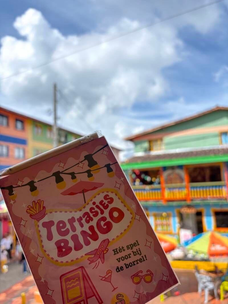 De rest van de middag pakken we wat terrasjes in Guatapé, waar de terrasjesbingo die de afgelopen Sinterkerstennieuw onze hoofdprijs vormde, voor het eerst het licht van de dag ziet. We vinden een terrasje op een balkonnetje waar het prima vertoeven is.