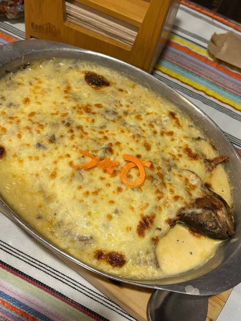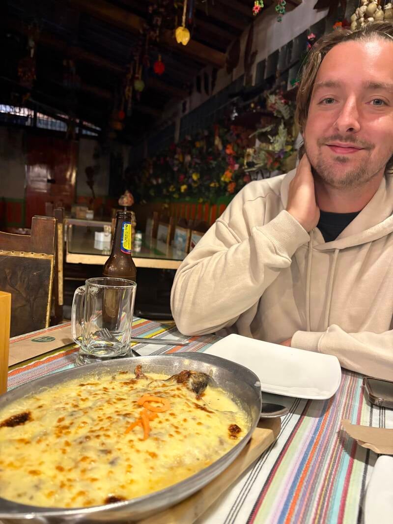 Na aankomst duiken we snel een restaurant in. Die plaatselijke keuken is ons in Jardín wel bevallen, dus besluiten we ons vanavond eens te meer aan de lokale delicatesse te wagen: de Trucha Gratinada! Ook deze keer liet Geertje me verrassen: wederom zin in een lokaal gerecht, dus Geertje gaat online op zoek in dat ene spaarzame uurtje bus waarin ze wél wakker is. Salento ligt dichtbij een rivier en het schijnt zo te zijn dat er een hoop forellen dat water hun thuis noemen, dus dat is precies wat we krijgen: een gegratineerde forel op typisch Salentose (geen idee of ik dat goed schrijf) wijze die we samen delen! Maar goed ook, want het is een flinke schaal, maar wel een schaal die ons gelukkig goed weet te bekoren.
