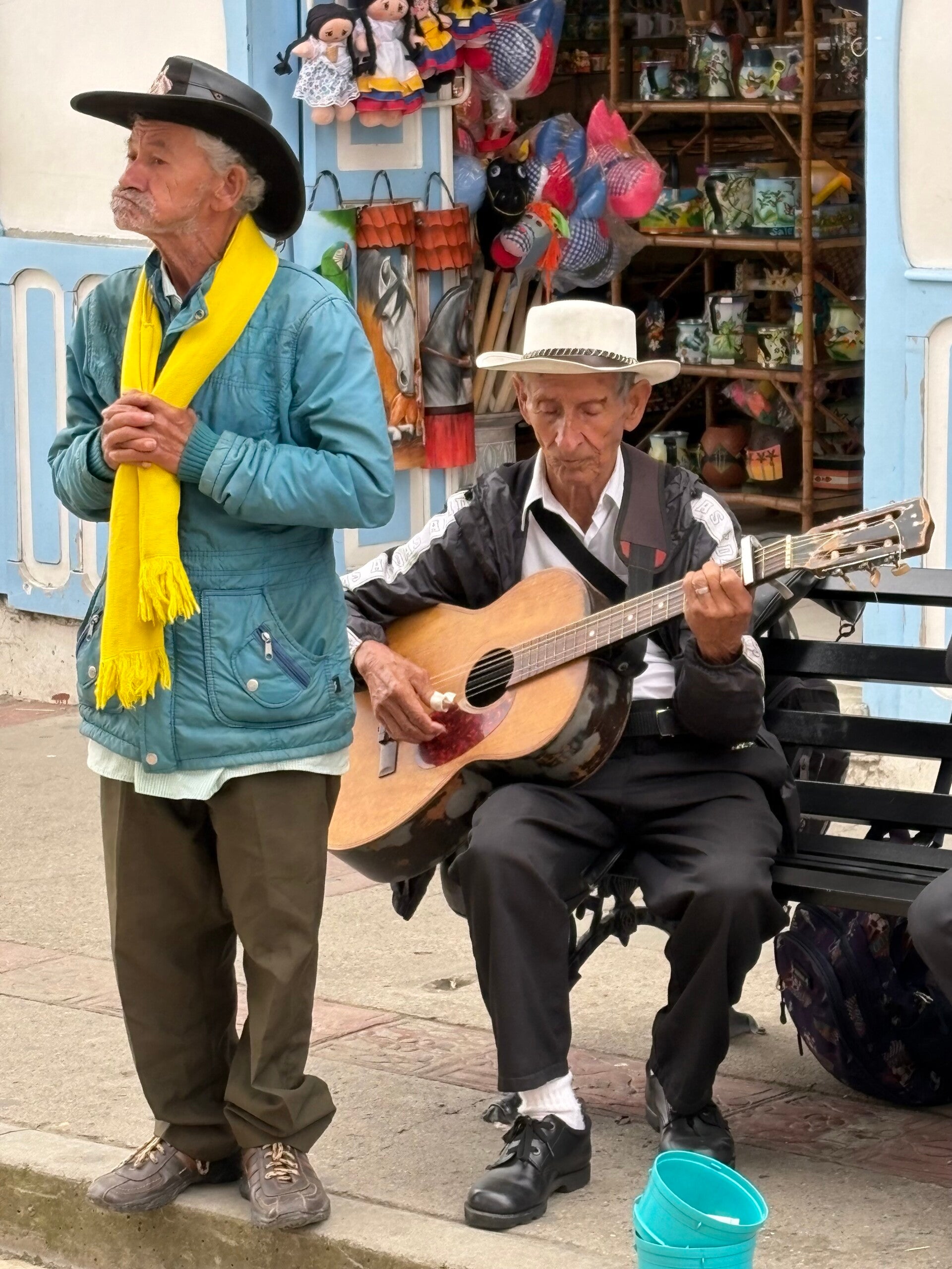 Dus doen we dat ook. Met iedere locatie die we bezoeken, daalt het kwik een beetje en aangezien Geertje schaars in de lange broeken zit en ik nog maar één trui heb omdat ik mijn tweede ergens op de San Blas-eilanden heb laten liggen, hebben we een duidelijk doel vandaag: kleding shoppen. Valt nog niet mee: de winkelstraat, die door toppers van straatmuzikanten als domein beschouwd wordt, barst van de leuke, schattige tiendas, maar broeken blijken hier niet zo populair, evenals truien die niet te veel ruimte in beslag nemen. Hoodies en paisa-poncho’s vormen hier de mode, maar het lukt ons uiteindelijk om die speld in de hooiberg te vinden en aan het eind van de dag zijn we twee kledingstukken rijker en weet ik zelfs nog een pet op de kop te tikken om die immer langer wordende haardos in bedwang te houden.