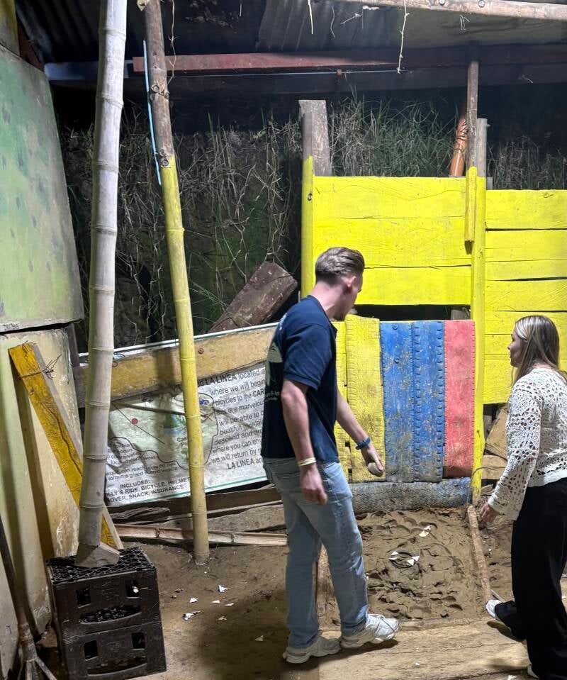 Als we internet mochten geloven, dan geeft werkelijk iedere website aan dat dat tejo onverwachts toch nog best wel lastig is. Je leest het zo vaak, dat je er een punthoofd van krijgt. En de realiteit? Nou... het is... best wel lastig! We spelen drie potjes twee tegen twee in alle mogelijke combinaties en het komt vaak genoeg voor dat die metalen tejo door de lucht vliegt, je jezelf al onoverwinnelijk waant, hij precies in het midden van die ring landt, maar er geen enkele papelita de verdoemenis in geknald wordt. In het begin denken we dat ze ons voor de gek houden en er niets in die driehoekjes zit. Dus Geertje bedenkt om van dichtbij met Roy zo’n steen effe op die driehoekjes te gooien. Spijt komt na de daad, want de reactie doet vermoeden dat er een aanslag wordt gepleegd, zo hard is die eerste knal. Ik krijg de meeste papelita’s tot ontploffing gebracht vanavond (ik denk, ik zeg het toch maar even), maar ook even een shout-out naar Geertje, die bij haar eerste succesvolle knal matig gillend een paar meter naar achteren rent alsof ze een giftige vogelspin ziet die het op haar gemunt heeft.