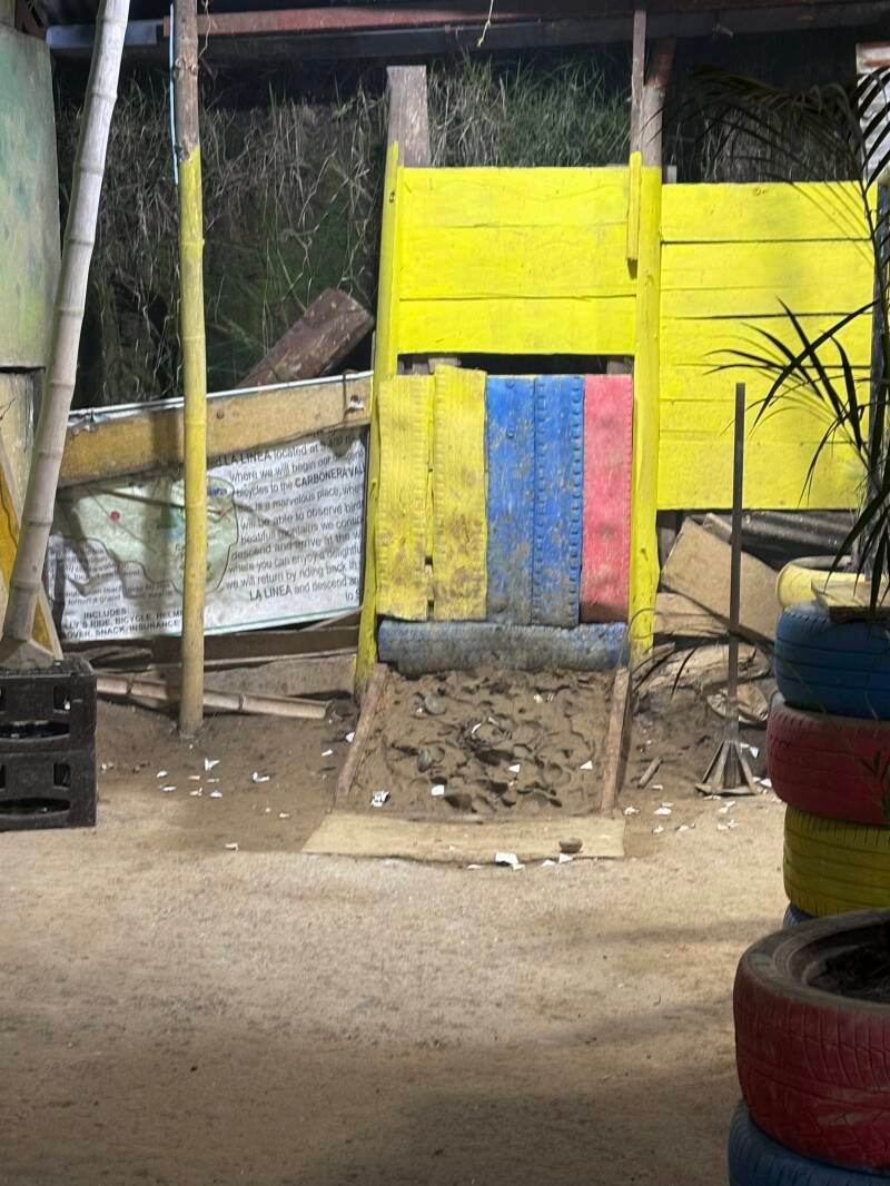 Wat Julio ons nog meer op het hart drukt, is dat onze veiligheid het best gewaarborgd blijft als we onszelf onderschatten. “Start with underconfidence”, zei die. Nou, die underconfidence heeft zo’n tien meter geduurd kan ik je vertellen, want die afstand overbruggen we voordat de innerlijke Puck Pieterse naar boven komen en we als malloten over die weg razen. Want razen, dat doen we. Downhill mountainbiken betekent natuurlijk alleen maar omlaag (daarom beginnen we natuurlijk op 3400 meter), dus die trappers zitten er voor de joeks op. En we razen deze ronde maar een klein kwartiertje, want dan zijn we bij La Carbonera.