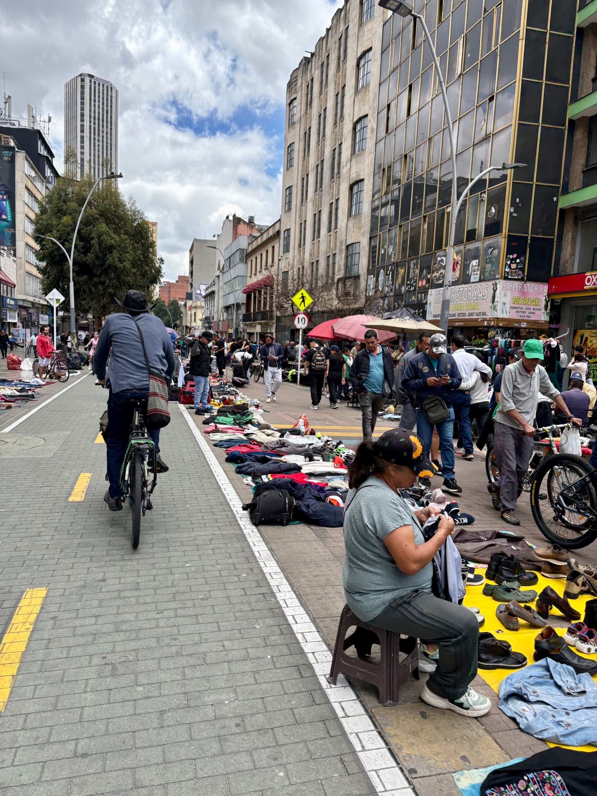 We starten ons tochtje in La Candelaría. Dit is de toeristenwijk waar de meeste backpackers en vakantiegangers zitten. Een beetje wat El Poblado voor Medellín is, is La Candelaría dat voor Bogotá, dus. Via een kunstenaarswinkel (Bogotá blijkt een stad van enorm veel kunst te zijn) fietsen we over een fietspad door een enorme markt waar geen einde aan lijkt te komen. Overal zitten mensen op straat met kleedjes en de meest diverse prullaria die je maar kunt bedenken. Van hoeden en kleding, tot hondenvoer en fietsonderdelen: je kunt het vinden op de (illegale) straatmarkt van Bogotá.