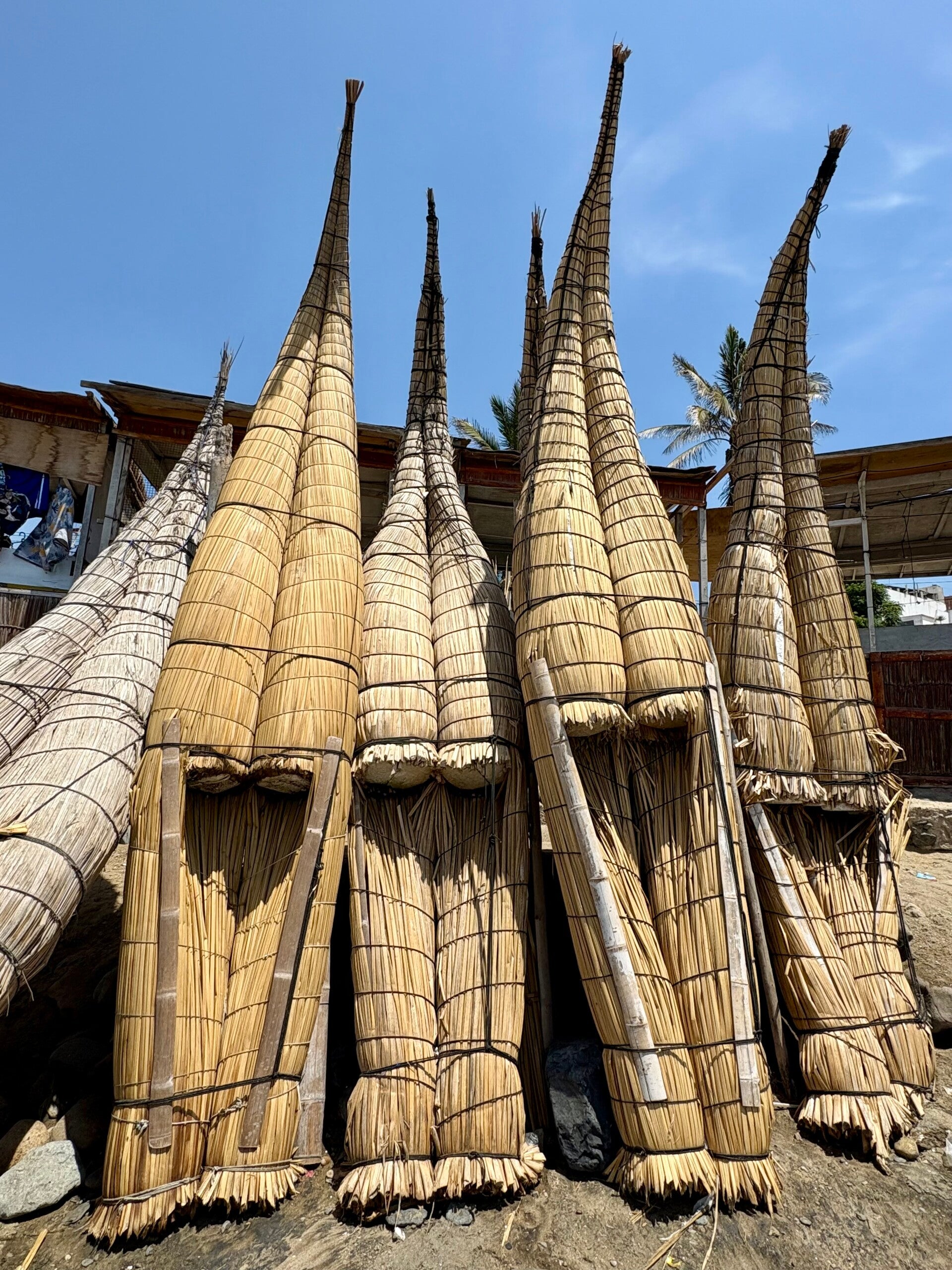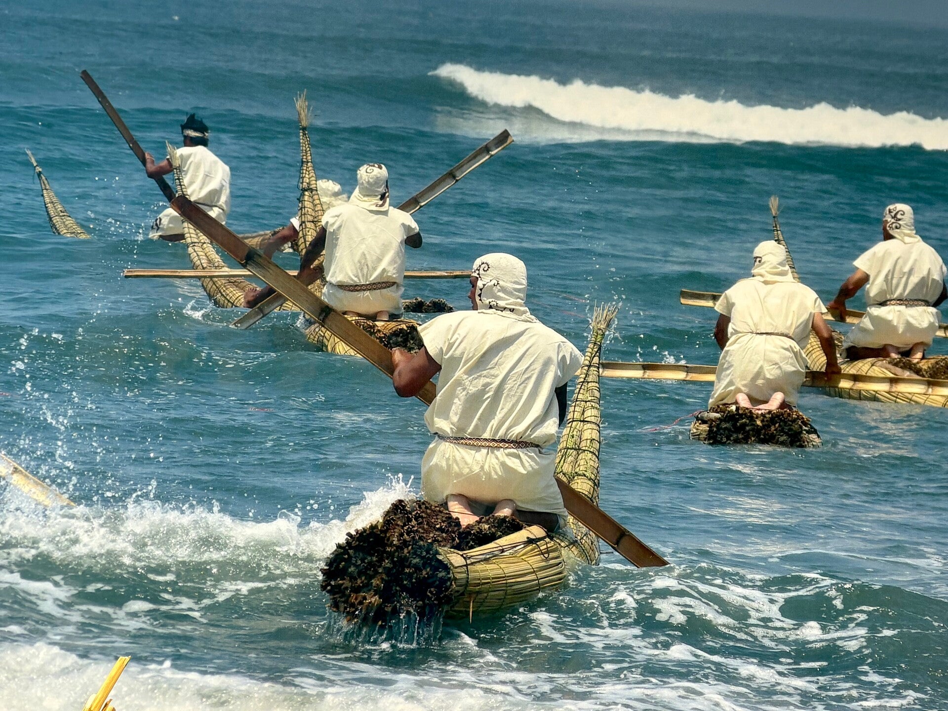 De voorlopers van de Chimú deden dat hier 3000 jaar geleden namelijk al. Ja, nog toen Jezus een zaadcel in een zaadcel in een zaadcel tot de macht tien was, werd er in het gebied dat we vandaag als Trujillo en Huanchaco kennen al gesurft. Dat denken ze namelijk omdat er op 3000 jaar oude vazen al foto’s te zien waren van surfende mannen. Goeie bron, me dunkt. Dat deden ze niet zomaar, nee, dat deden ze op caballitos de totora. Vertaling: rieten paardjes. Jawel, de eerste surfplanken ooit waren van riet en hebben de vorm van clownsschoenen met zo’n flauwe krul aan het uiteinde van de neus. En wat het mooiste is? Vandaag de dag worden die rieten paardjes nog steeds gebruikt in de visserij! Iets met een traditie in stand houden.