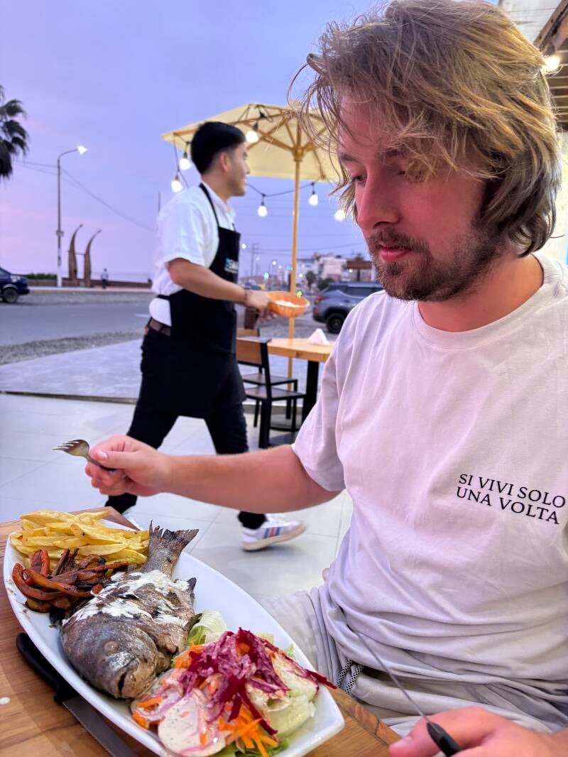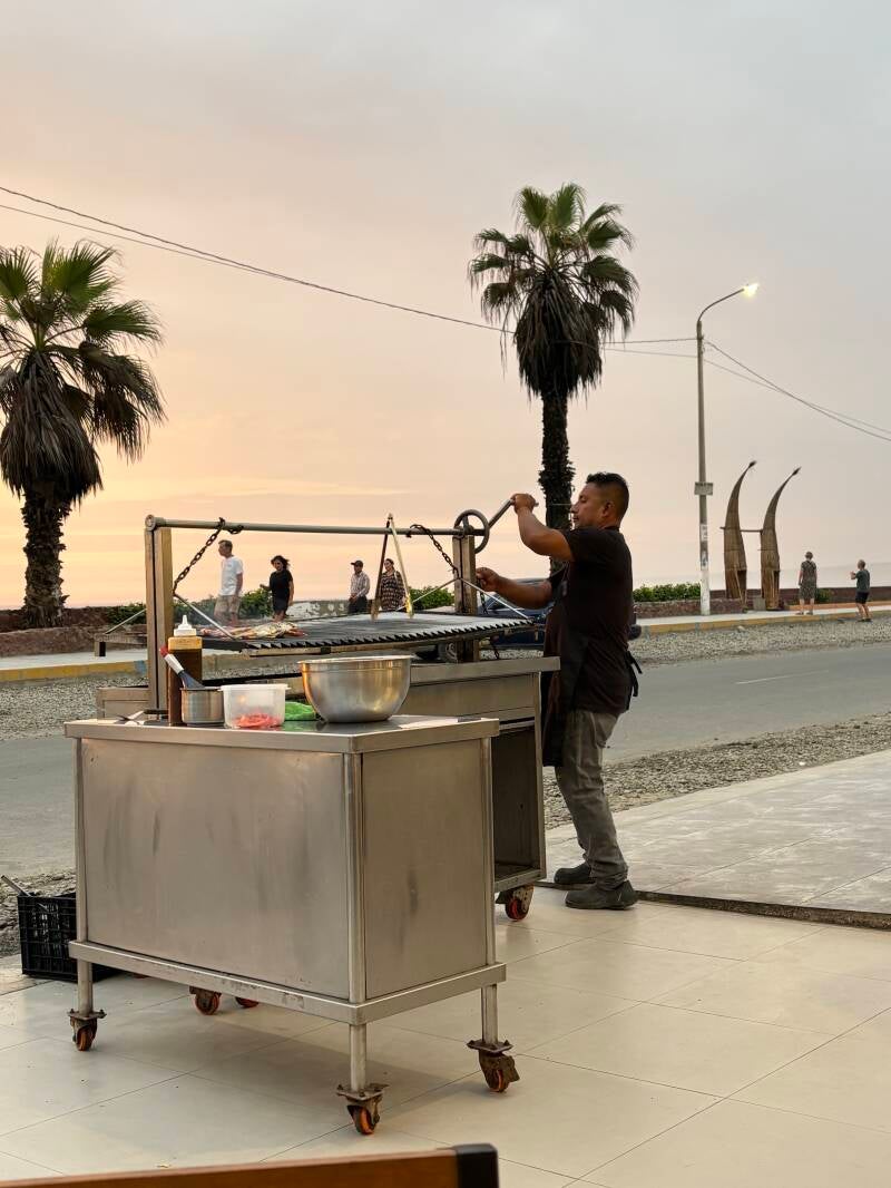De definitieve afsluiting van onze tijd in Huanchaco gaat wel lekker. Serieus, deze keer. We eten aan de kade en nemen plaats bij een restaurantje waar het vlees en vis ter plekke op de straat gegrilld wordt. Geertje een heerlijke ossenhaas en ik een Peruviaanse chita, een vis die in de Peruviaanse wateren zwemt en vanochtend nog gevangen is. De entourage met weer die prachtige zonsondergang als decor en de uitstekend Engels sprekende (Peruvianen spreken vaker Engels, blijkt al) grillmeester maken de afsluiting van Huanchaco perfect.