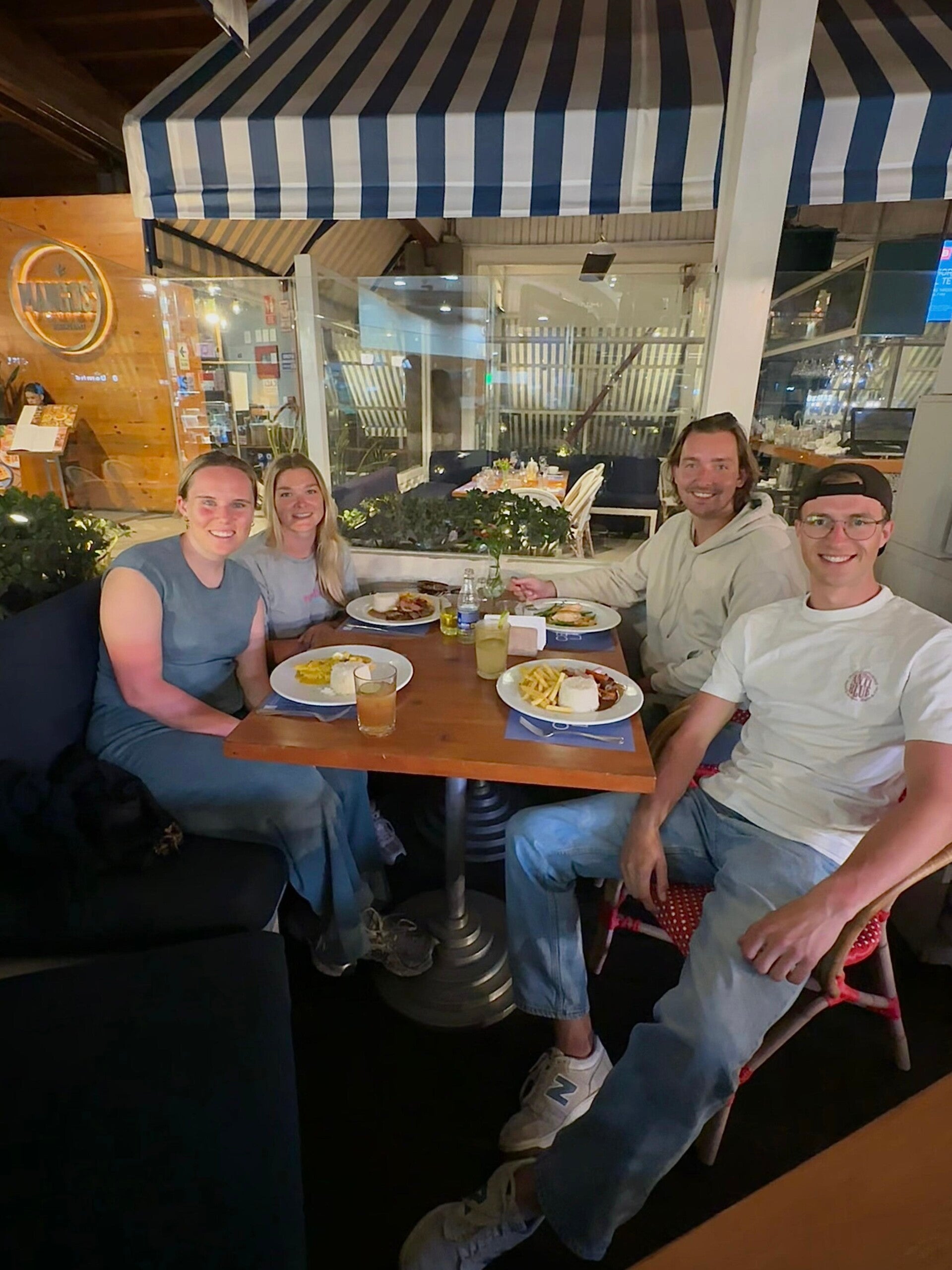 We sluiten af bij het winkelcentrum Lancomar waar Geertje de afgelopen anderhalve week overuren heeft gedraaid. Want dat zalmtartaartje dat ze met een onbetaalbaar uitzicht een week geleden gegeten had, mogen wij ook ervaren. Ik ga veilig voor een gegrilde kip (ik heb voor vandaag nog een streng dieet van de dokter), maar de zalmtartaar ziet er onweerstaanbaar uit. Zo bevestigen de twee dames die mijn tafelgenoten zijn, dat ook. Het moge duidelijk zijn dat dit een perfecte afsluiting is voor een bijzonder enerverende anderhalve week, een anderhalve week die we nooit meer over willen doen, maar ook nooit hadden willen missen.