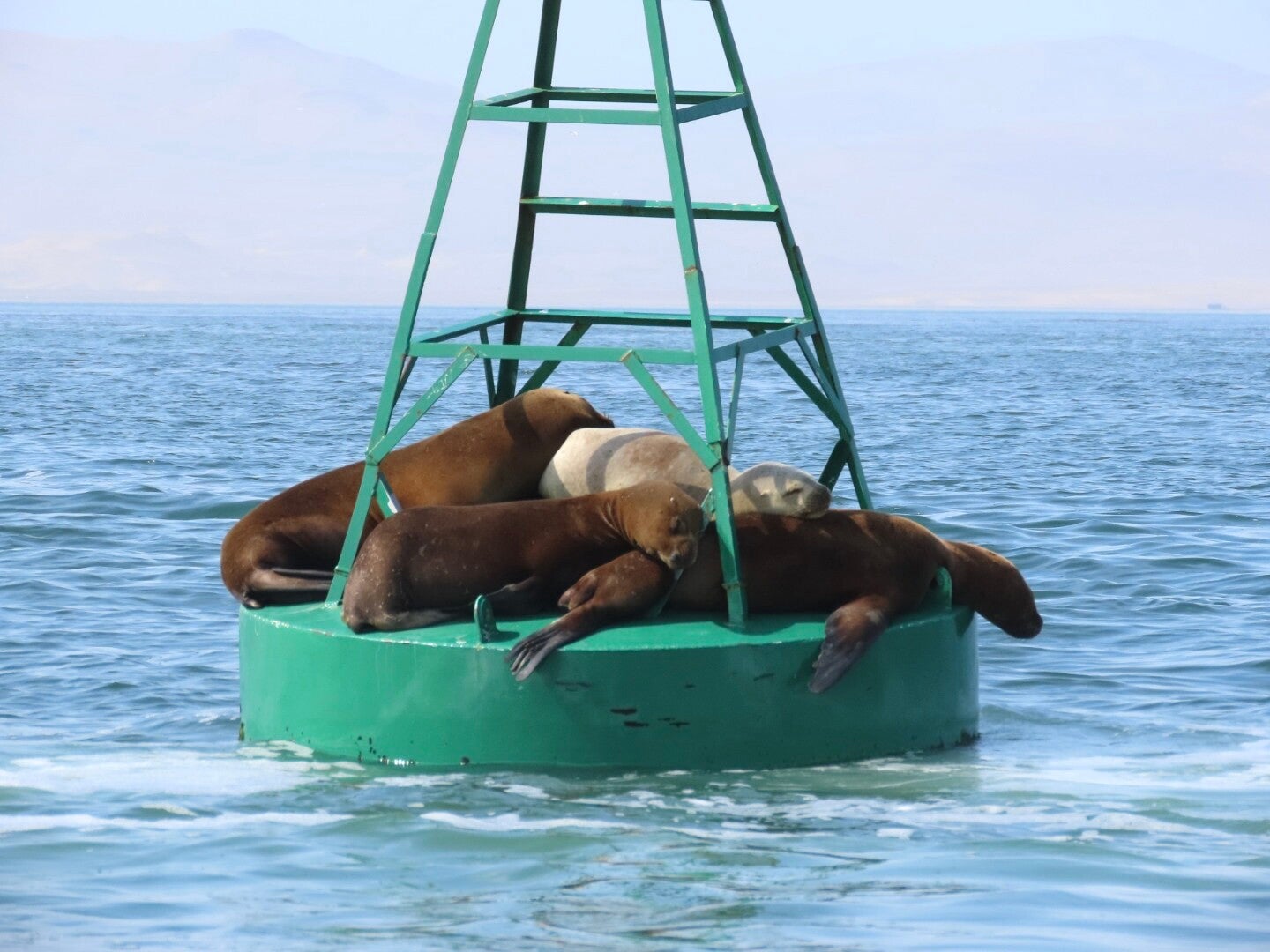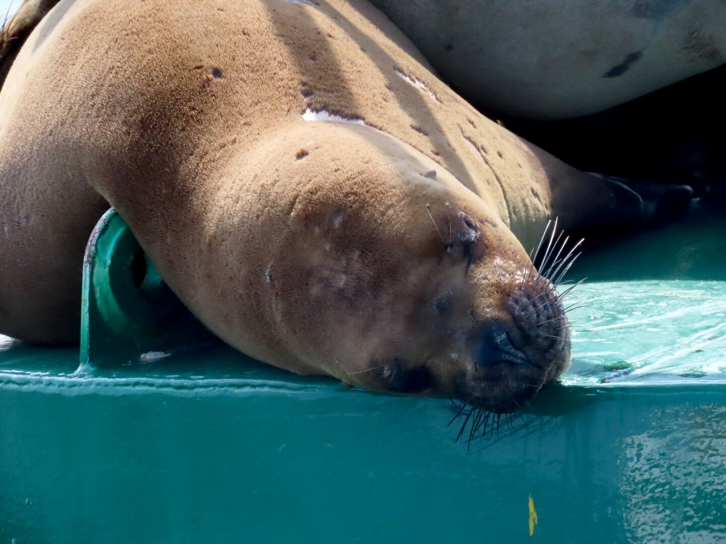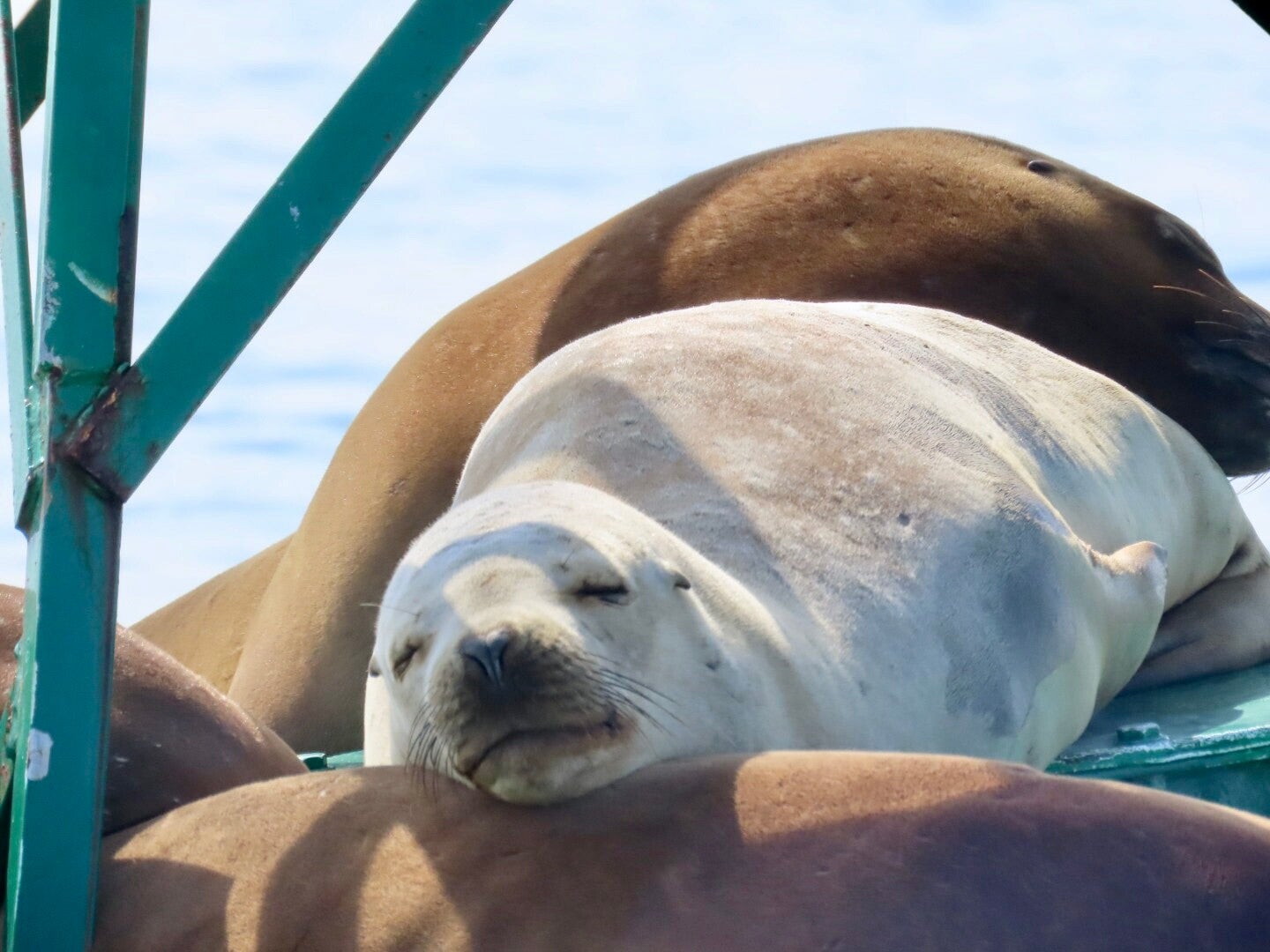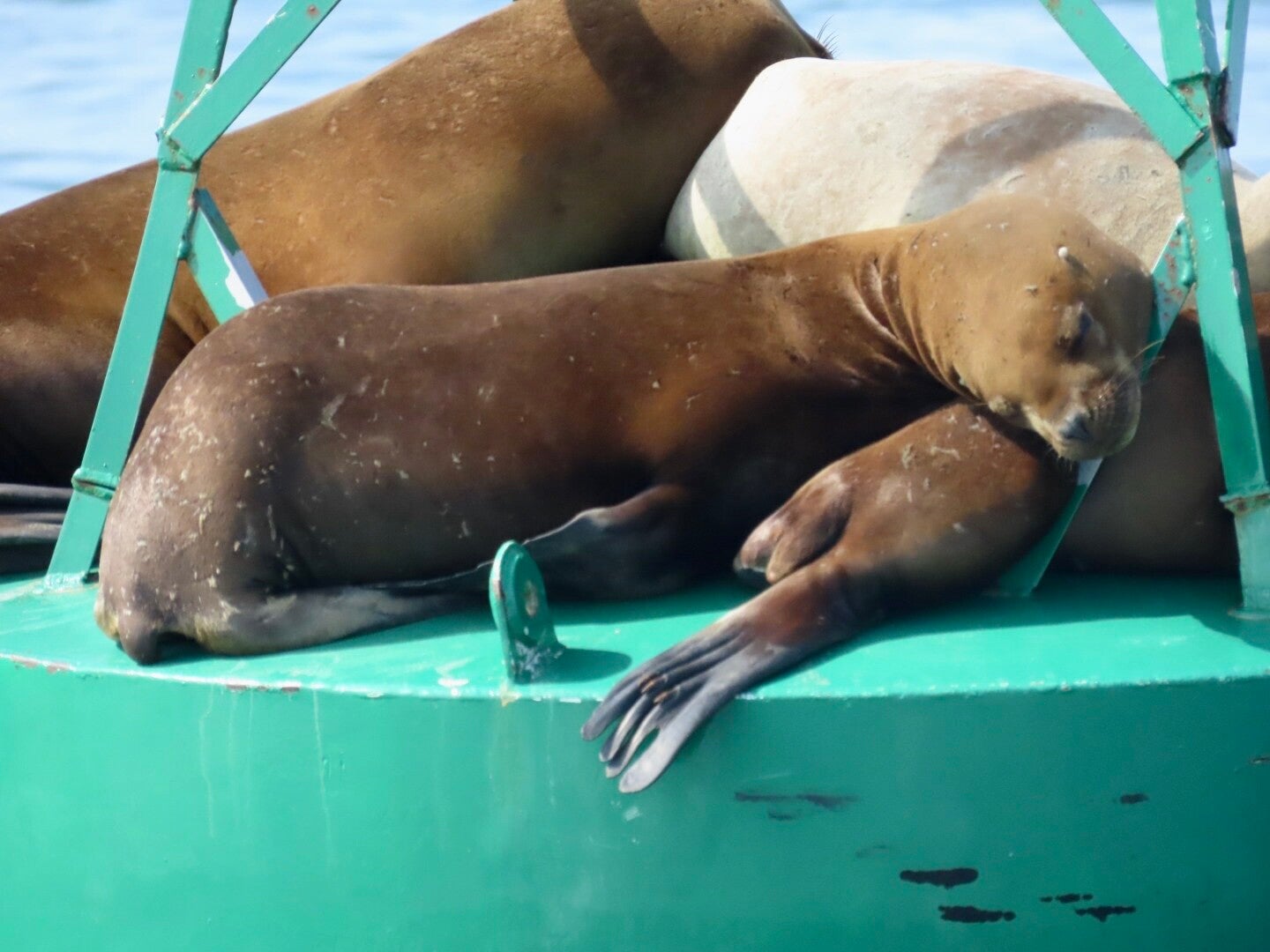 Op de terugweg is de koek nog niet op: we varen langs een boei die onder de plaatselijke zeeleeuwenbevolking een populaire zonnebank blijkt: vijf stuks in allemaal verschillende kleuren liggen op en over elkaar te chillen. En wat komen we dichtbij! Geertje heeft al fantasieën over een nieuw huisdier en de boot is compleet stil geworden en hoewel we het natuurlijk niet doen, zouden we die beesten bijna over hun neus kunnen aaien. Wauw!