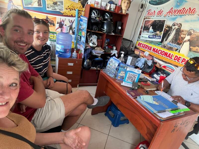 Of toch niet. We krijgen namelijk om 7.30 ’s ochtends te horen dat de zee vandaag te lomp doet, dus we moeten ons schikken naar het alternatief wat ze de White Islands noemen. Kan er niks over vinden op internet, dus ik denk dat het gewoon een subgroepje is van die Islas Ballestas, dus het zal wel. Zodra we de bevestiging krijgen dat we dezelfde dieren gaan spotten als bij de eigenlijke tour, klinkt er iets bekends vanachter ons in de deuropening: ‘daar zijn ze weer!’ Edwin en Eva van de Lima Bites Tour! Die dekselse Zeeuwen komen weer bij ons binnen gelopen en net als twee dagen geleden, vormen we met z’n vijven een groepje. Wat een toeval.