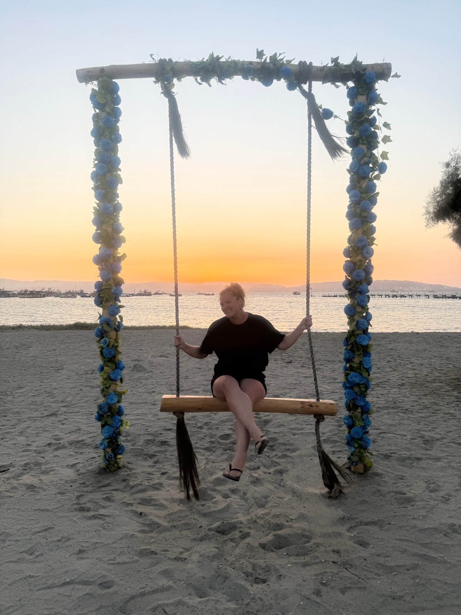Om ons geweldige scooterdagje af te sluiten, vinken we nog twee strandjes af. Inmiddels weet je het waarschijnlijk wel, maar als ik water zie, dan moet ik erin. Die hele westkust van Zuid-Amerika bestaat uit ruige kusten met lompe golven en flinke stromingen en dit natuurreservaatje doet vrolijk met die trend mee. Bij Playa la Mina mag er wel gezwommen worden! Stroming schijnt er minder te zijn, dus daar moeten we heen. Dat de stroming minder is, klopt, maar da’s nog steeds heel relatief, want die stromingen onder het oppervlak trekken me nog een paar keer mee. Geertje en Anita houden het dus maar lekker bij pootjebaden.