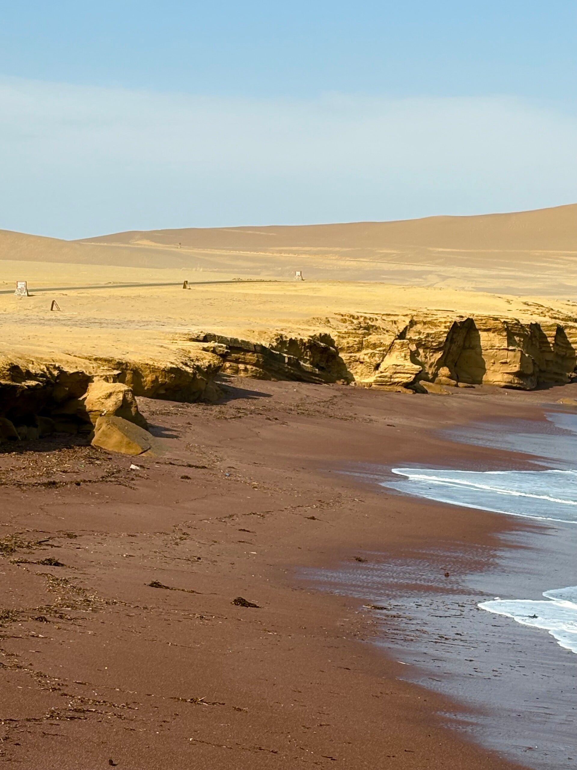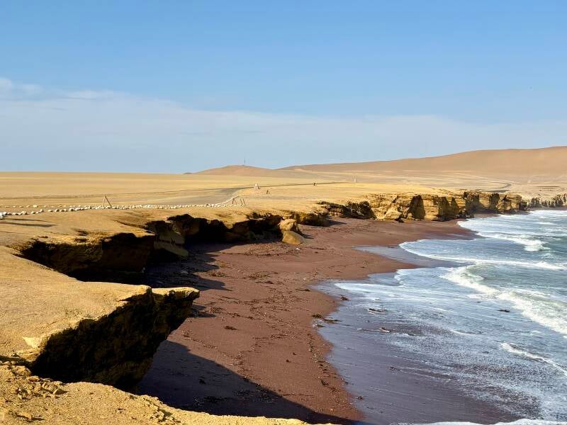 Wel mogen we alleen maar door Paracas en door het nabijgelegen Reserva Nacional de Paracas crossen en mensen, wat een fantastisch, weergaloos, buitenaards mooi natuurgebied is dat Reservaatje! We zijn nu in de Sechura-woestijn. Inderdaad, die begon al in Lima. De grootste van Peru, is wat ze zeggen. Dat Reserva Nacional de Paracas is dus een gedeelte van die woestijn en ligt op een schiereiland nabij Paracas. Als we entree betalen en aan ons eerste stuk beginnen, wordt al meteen duidelijk dat vandaag een speciale wordt. De natuur in dit park is zoals geen enkele plek die we ooit gezien hebben! Een uitgestrekte woestenij aan dorre zandvlaktes in prachtige gele, rode en bruinen tinten strekt zich voor ons uit. In de verte doemen enorme bruine bergen op. Het landschap is weids, uitgestrekt en buitenaards. Serieus: als ze ons hadden verteld dat die scooter ons naar Mars zou teleporteren, dan hadden we het ook geloofd. Opdat vandaag nog lang mag duren.