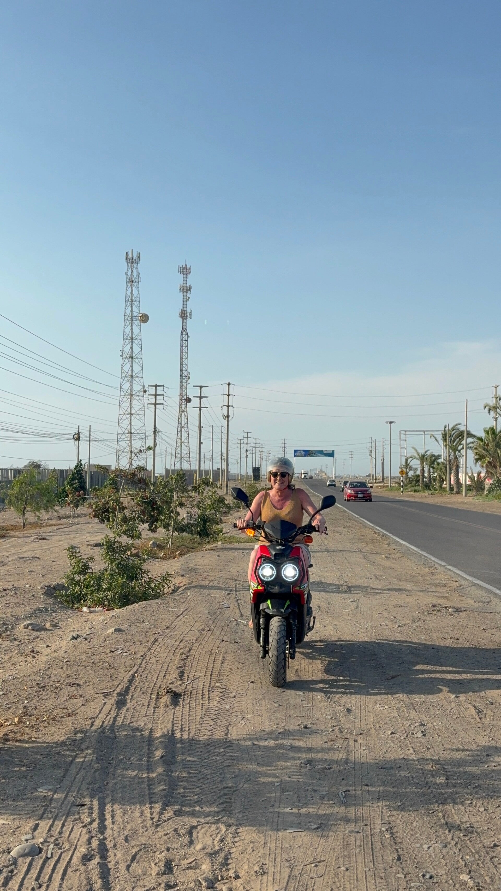 Als we wegrijden slipt ze zonder dat we het doorhebben met haar achterband richting Argentinië en ziet ze ons niet meer op de weg. Ik zie na een stukje tuffen dus ook geen schoonmoeders meer in m’n spiegels, dus besluit ik met Geertje bij de afslag Paracas even te wachten. En jawel hoor: een halve minuut later komt daar Anita aan gebanjerd, gebarsten helm fier balancerend op haar kruin. Ik claxoneer, zwaai naar Anita, ze kijkt naar mij, ik kom in de illusie terecht dat we oogcontact maken en… ze rijdt door! Met een rotvaart van heb ik jou daar schiet ze Paracas voorbij en rijdt ze ons voorbij alsof we er niet staan, want onmiddellijk zetten we de achtervolging in, maar seconden later is er al geen spoor meer voor onze metgezel te bekennen! MADRE LOCA! Ze is de snelweg opgeknald, richting Pisco (waar we volgens de ondertekening van het contract vanochtend niet mochten komen met de scooter) en het duurt werkelijk minuten voor we Anita te pakken krijgen met de appjes en belletjes van Geertje, voordat Anita eindelijk doorhad dat ze niet meer op het goede spoor zat. Het is me in elk geval wel duidelijk waar Geertjes navigatieskills vandaan komen.