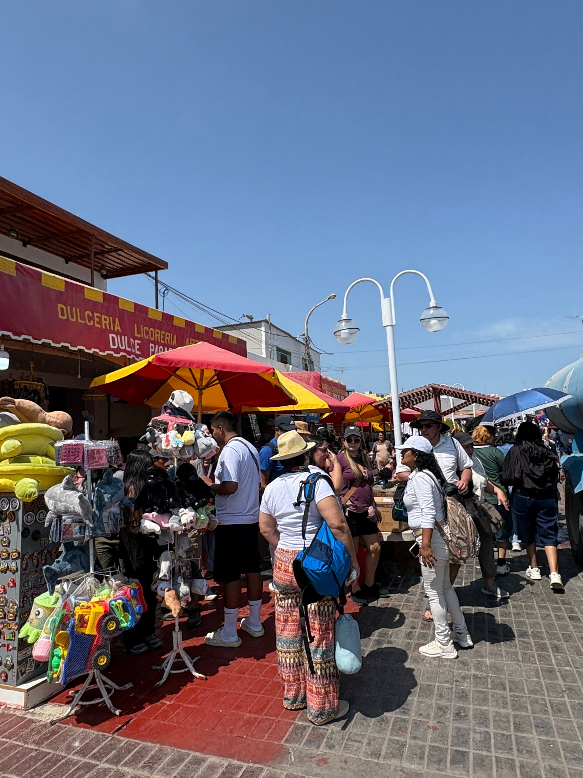 En weer aan land is het tijd om door te reizen. We zeggen gedag tegen de Zeeuwen, Anita en Geertje struinen nog wat door het centrum van Paracas dat door Semana Santa bommetje vol geraakt is, Anita shopt nog souveniertjes en we kopen met z'n drieën een armbandje. We drinken nog een biertje op het terras, waar de pelikanen ook allesbehalve schuw zijn. Als ik Facebook nog zou gebruiken en in een onzekere puberteitsfase had gezeten, dan zou ik het volgende plaatsen: Paracas 2026, wat was je mooi!