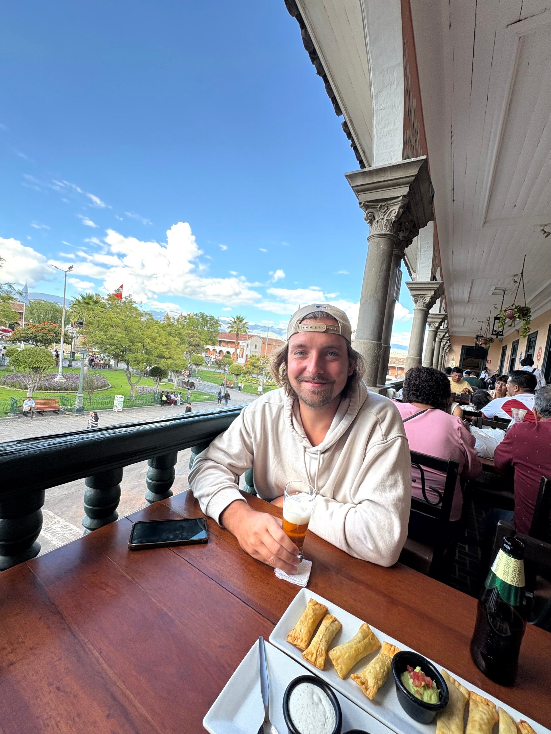 Daarna valt ons oog op de balkons en die ballustraden die de huizen naast het Plaza de Armas versieren. Vier van die balkonnetjes bevatten namelijk ook terrasjes! Nou, idyllischer dan dat ga je het niet krijgen met dit sfeervolle plein als achtergrond. Via een tourbedrijfje waar we alvast een halve dagtour voor morgen boeken, gooien we zes bij het derde terras (de andere terrasjes zaten vol) en inderdaad: we hebben toch weer een pareltje van een dinerplek binnen weten te hengelen. We voelen ons net Spaanse conquistadores (maar dan wel de vredelievende soort) terwijl we een Cusqueña drinken met de eeuwenoude gebouwen en straten op de achtergrond. Het eten is ook weer geweldig: we delen een kwart kip en een stuk of 12 tequeños. Tequeños, het volgende fenomeen van de Peruaanse keuken. Gefrituurd deeg gevuld met kaas. Lijkt op loempia, maar dat is het dus niet. Evenals een loempia wel weer mega lekker. Net als de sausjes die we erbij geserveerd krijgen.