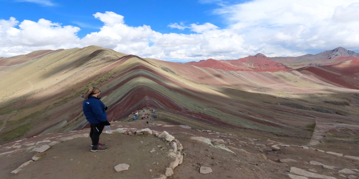 En dan zijn we boven. En het is het allemaal waard. Op een duizelingwekkende hoogte van 5007 meter hoeven we de beeldschone Rainbow Mountain alleen te delen met de lokale Quechua-bevolking die souvenirs verkoopt en een wazige Belg die op z’n vingers getikt wordt omdat-ie tegen de regels in tóch met z’n drone besluit te vliegen, te delen. Waarom dit de Rainbow Mountain heet, is meteen duidelijk. Een prachtige berg in zeven verschillende kleuren ligt voor ons en als we denken alles gezien te hebben en niet meer verbaasd te kunnen worden, staan we hier op vijf kilometer boven zeeniveau wéér met de mond vol tanden, wéér te kijken naar een fenomeen dat we nog nooit gezien hebben. We hebben geluk met het weer: hoewel we drie lagen én handschoenen dragen, schijnt de zon fel (mijn gezicht verbrandt flink) en springen de prachtige kleuren er nóg veel harder uit. Wat mij betreft had het ook eerder de Rainbow Valley kunnen heten, want de hele vallei is een explosie aan kleuren. Er zijn groene bergen. Er zijn grijze bergen. Besneeuwde witte bergen. Bruine bergen. Rode bergen. En dan die knalblauwe lucht. Wát een plek weer.