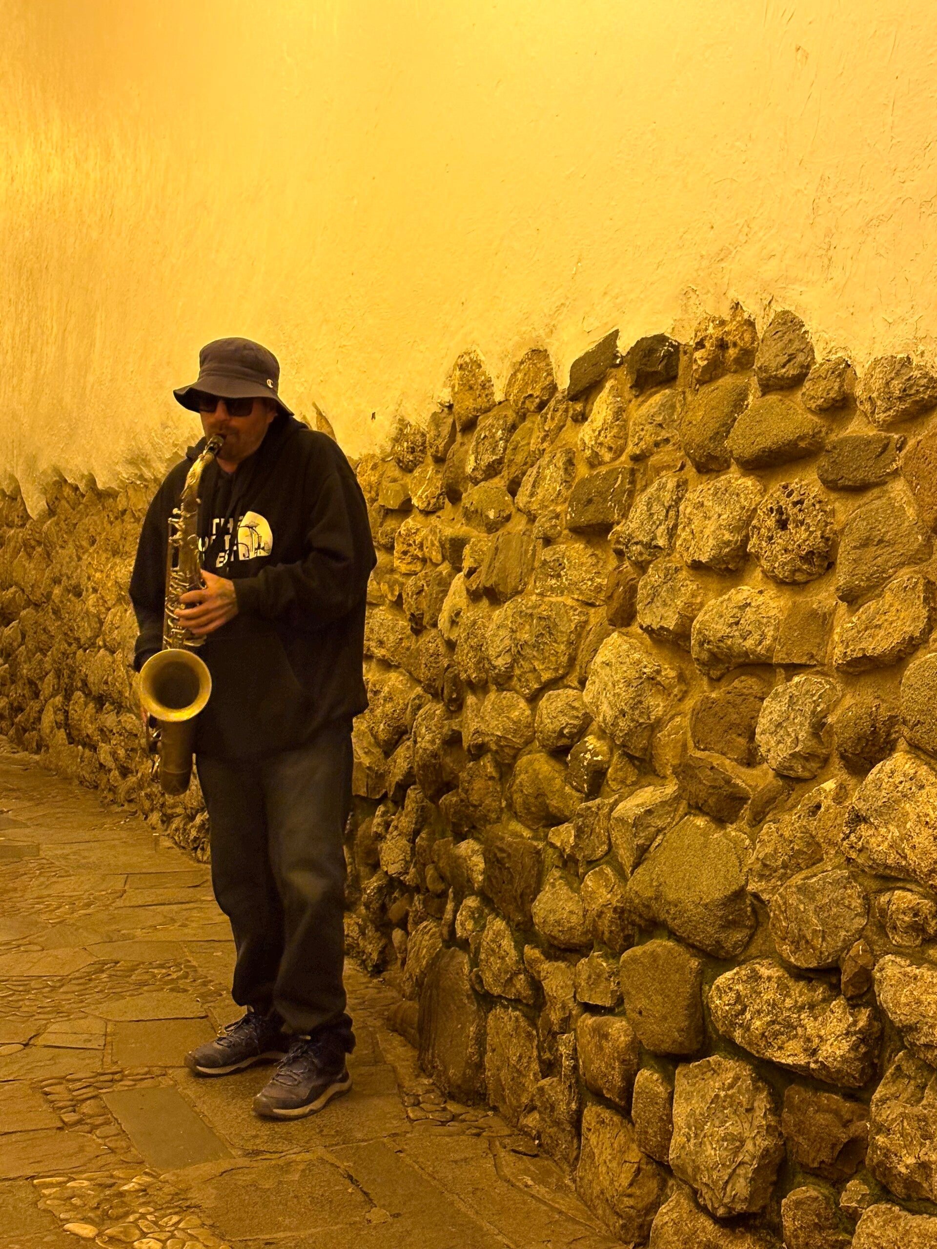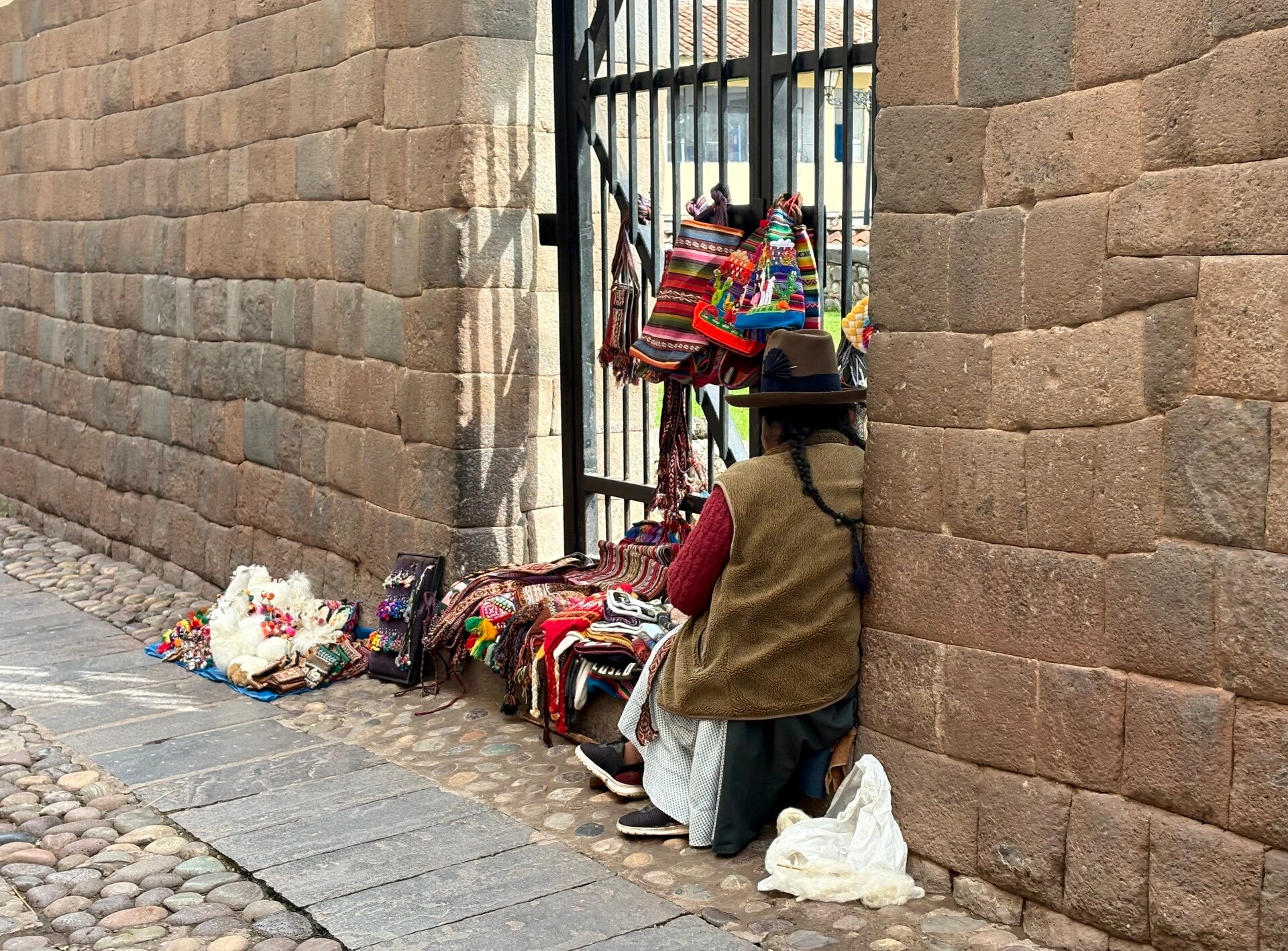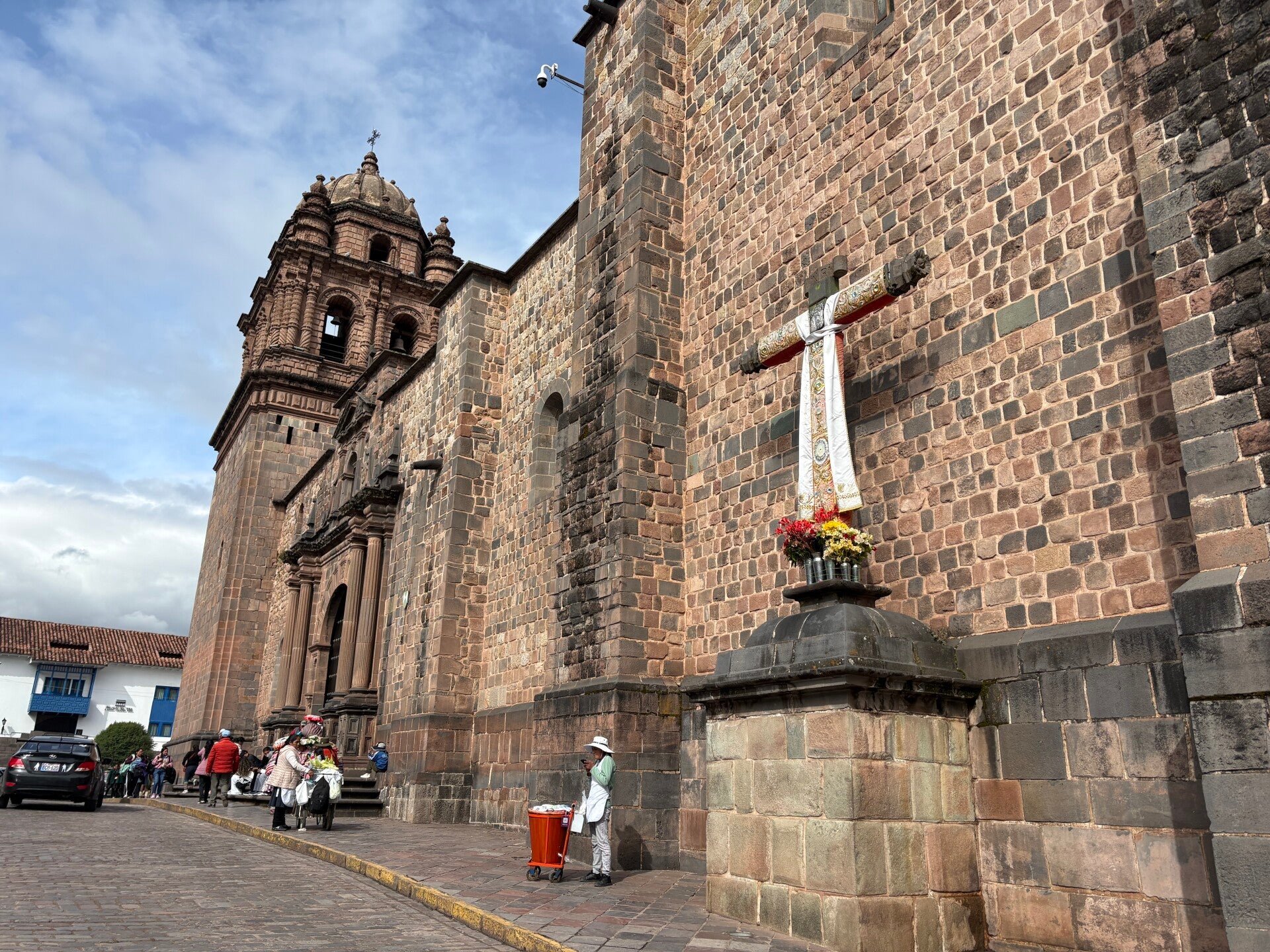 De middagplanning hadden we gelukkig al gemaakt: weet je nog dat we een AI-Walking Tour hadden gedaan? En dat die door een hereniging met oude bekenden even een pas op de plaats moest maken? Nou, die walking tour gaan we vandaag afmaken! Wel in tegengestelde richting: we slapen nu in het Oude Centrum, dus we eindigen in San Blas deze keer. Onze eerste stop is Qorikancha, de belangrijkste tempel van het hele Incarijk, de tempel gewijd aan de Zonnegod Inti. En toen kwamen de Spanjaarden om de hoek kijken in de 16e eeuw en die hebben op het fundament van de tempel het klooster Convent van Santo Domingo gebouwd. Mooi gebouw.