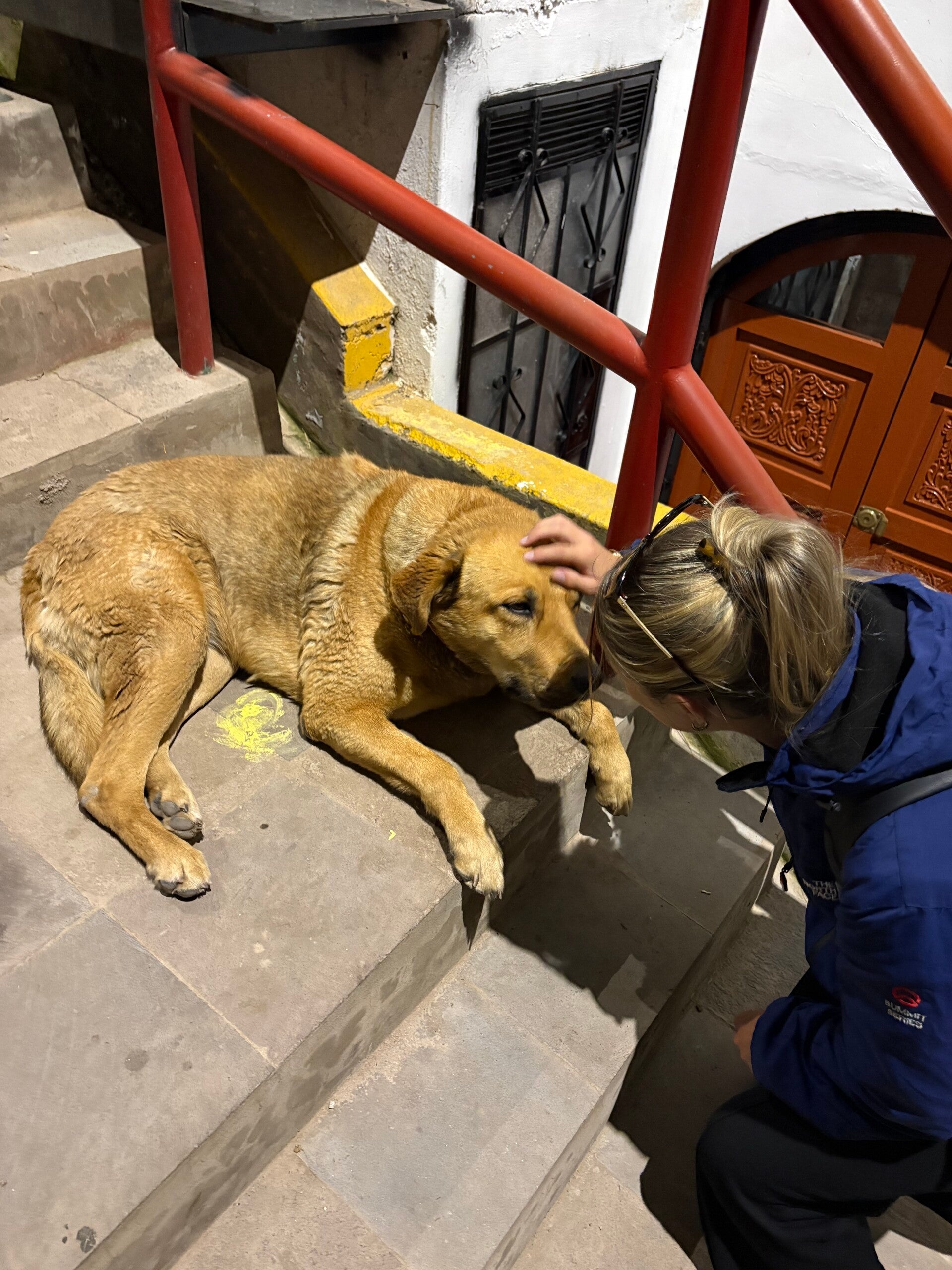 Maar eerst een rustdag! We zijn pas laat terug in Cusco en hebben een nieuwe AirBnB gevonden die bij aankomst de hygiëne niet bovenaan de prioriteitenlijst had geplaatst (Geertje voelt zich na het douchen nog viezer dan ervoor), dus Geertje gaat na het inchecken gelijk op zoek naar een nieuw appartement voor wanneer hier twee nachten uitgezeten hebben. Er is ook wel wat positiefs te benoemen, hoor: we hebben wel een fenomenaal uitzicht over de stad omdat dit huisje aan de bergwand gelegen is en we hebben twee lieve honden die buiten de voordeur altijd op dezelfde plek liggen. Bruno en Woef, zo heten ze, als ik Geertjes aanname mag geloven.