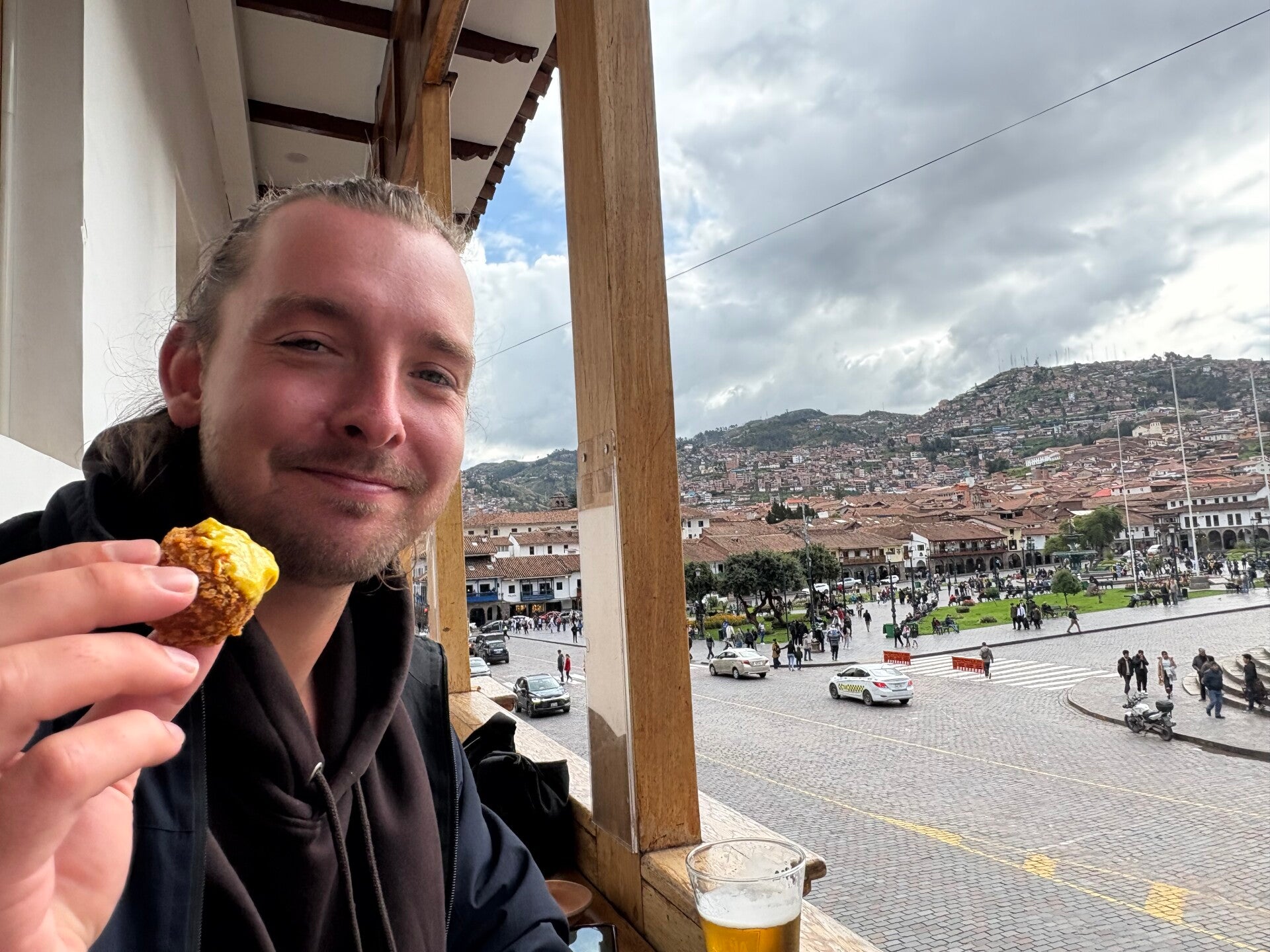 Dus neem ik je even mee door de hoogtepunten van drie dagen Cusco-stad. Na de sportsbar vinden we Massimo-café. Een MUST voor iedere Nederlander. Waarom? Bitterballen! Jawel, een Peruaanse vrouw spreekt ons in uitstekend Nederlands aan in een prachtig café waarvan iedere vierkante centimeter is gedecoreerd met schilderijen in Rembrandt-stijl, Amsterdamse bordjes met drie kruizen en zelfs met een fiets met daaronder de waarschuwing ‘verboden fietsen te plaatsen’. Mevrouw komt uit Cusco maar is getrouwd met een Hagenees! Ze wonen nu in Peru en hebben een Nederlandse bar. En wij hebben bitterballen. Win-win dus, zeker als we ook nog eens het geluk hebben dat de mevrouw een aantal Peruanen van een fucking appeltaart laat proeven om te oordelen of het een winstgevende menuoptie kan zijn. Die heimwee tijdens het ziek zijn was helemaal weg, maar goh, wat is de Nederlandse snackcultuur toch fantastisch! Het is heerlijk. En we hebben ons binnen no-time ook weer lekker herpakt. Na vier sigaretten uit het pakje dat mijn impulsaankoop was, trek ik al snel de conclusie dat bitterballen en appeltaart toch beter smaken. Met het verdwijnen van dat pakje in de prullenbak, is onze wederopstanding definitief.