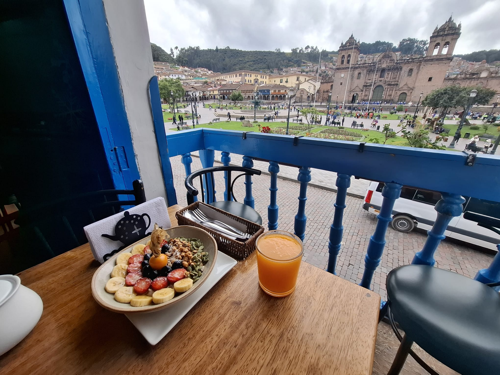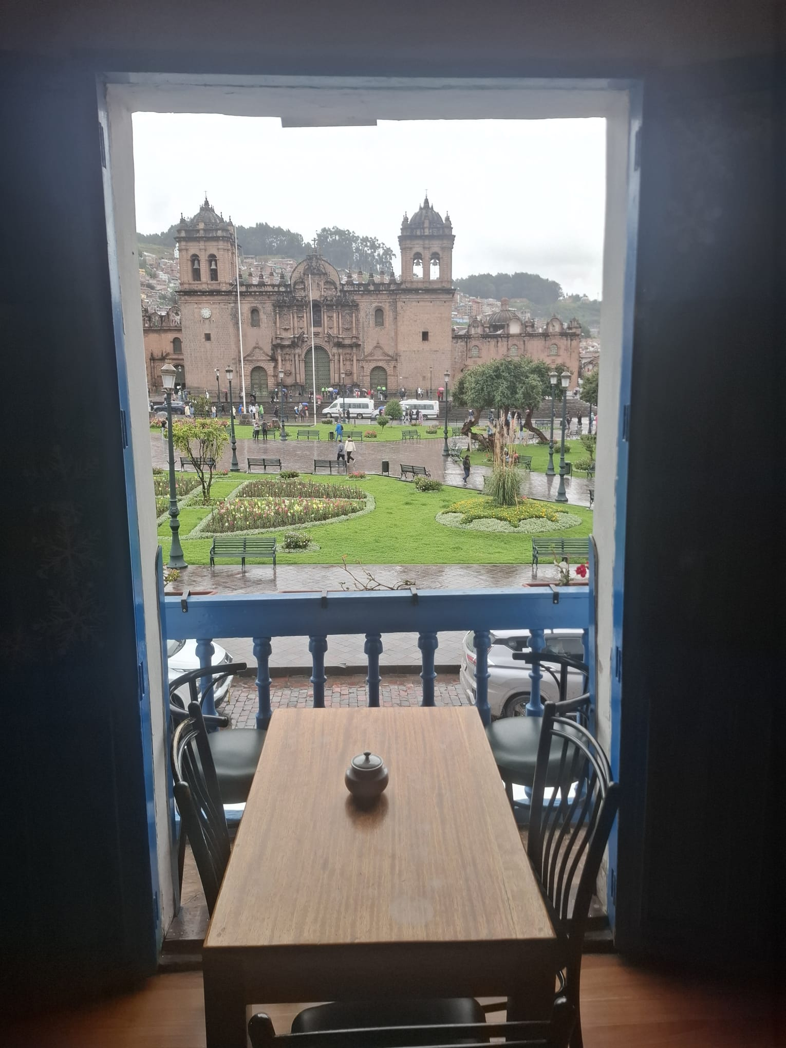 Dag drie starten we op het schilderachtige Plaza de Armas in het oude centrum met koffie en een ontbijtje terwijl we op een terrasje op een bovenverdieping (terrasjes op bovenverdiepingen in Peru zijn een must) uitkijken over het prachtige plein. Mijn teruggekeerde Giardia is een geluk bij een ongeluk: het is al twee dagen slecht weer en als ik niet die doktersafspraak had, dan waren we nu met die roadtrip bezig geweest. Nu is de planning dat we morgen gaan, en wie weet wat het weer morgen doet. Maar het is bijna 11.20. Het moment van de waarheid, op naar die MDL-arts.